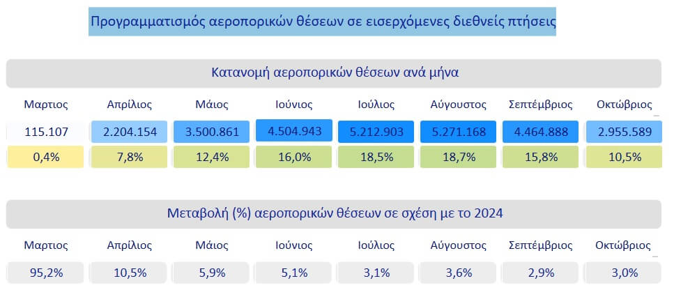 Η ποσοστιαία αύξηση προγραμματισμένων θέσεων είναι μεγαλύτερη κατά τους μήνες Απρίλιο (+10,5%), Μάιο (+5,9%) και Ιούνιο (+5,1%), μια εξέλιξη που παραπέμπει σε σταδιακή αύξηση της τουριστικής δραστηριότητας στην αρχή της σεζόν, αντίστοιχη με εκείνη που καταγράφηκε τους φθινοπωρινούς μήνες τα προηγούμενα δύο χρόνια.