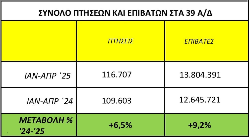 Αύξηση 9,2% σημειώθηκε στην επιβατική κίνηση το πρώτο τετράμηνο (Ιανουάριος – Απρίλιος) του 2025, στο σύνολο των αεροδρομίων της χώρας που διεξάγονται εμπορικές πτήσεις (39 αεροδρόμια: 24 της Υπηρεσίας Πολιτικής Αεροπορίας – ΥΠΑ, 14 της Fraport Greece και το αεροδρόμιο της Αθήνας).