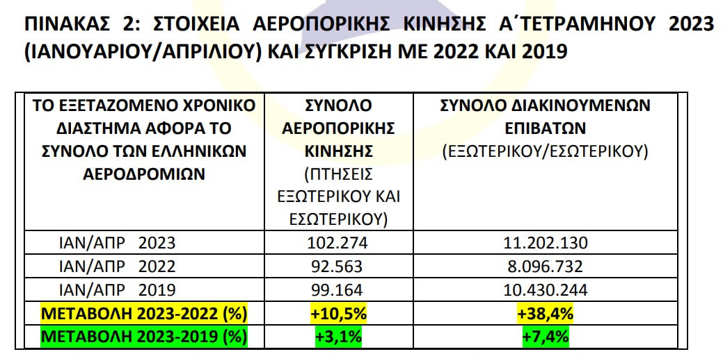 To πρώτο τετράμηνο (Ιανουάριος – Απρίλιος) του 2023, το σύνολο των διακινούμενων επιβατών στα ελληνικά αεροδρόμια (αφίξεις και αναχωρήσεις επιβατών εξωτερικού και εσωτερικού), έφτασε τα 11.202.130, έναντι 8.096.732 το αντίστοιχο διάστημα του 2022 και 10.430.244 επιβατών το 2019.