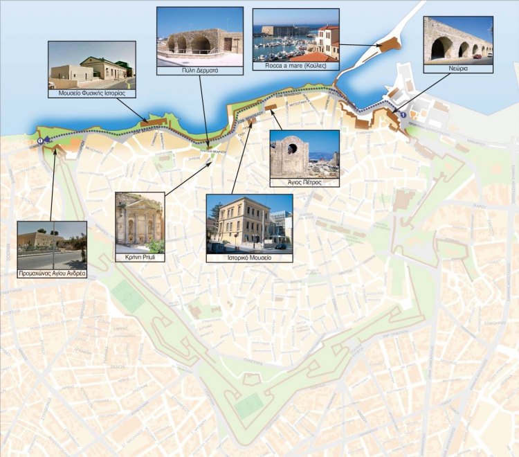 Η πρώτη διαδρομή θα καλύπτει την παραλιακή ζώνη και συγκεκριμένα από το ενετικό λιμάνι έως τον προμαχώνα του Αγίου Ανδρέα. Η δεύτερη διαδρομή θα καλύπτει όλη την πορεία των ενετικών τειχών. Η τρίτη διαδρομή θα είναι διαμορφωμένη, με τρόπο ώστε ο επισκέπτης να μπορεί να γνωρίσει τις ενετικές πύλες. Συγκεκριμένα θα έχει ως αφετηρία την πύλη Δερματά, τη Χανιώπορτα, την πύλη Παντοκράτορα, την πλατεία Κορνάρου, την κεντρική αγορά, τη Δικαιοσύνης και θα καταλήγει στο λιμάνι. Η τέταρτη διαδρομή θα συνδέει το ενετικό λιμάνι με το Πολιτιστικό Κέντρο και τέλος η πέμπτη διαδρομή θα αναπτύσσεται από τον κόλπο του Δερματά, προς την πλατεία Ελευθερίας.