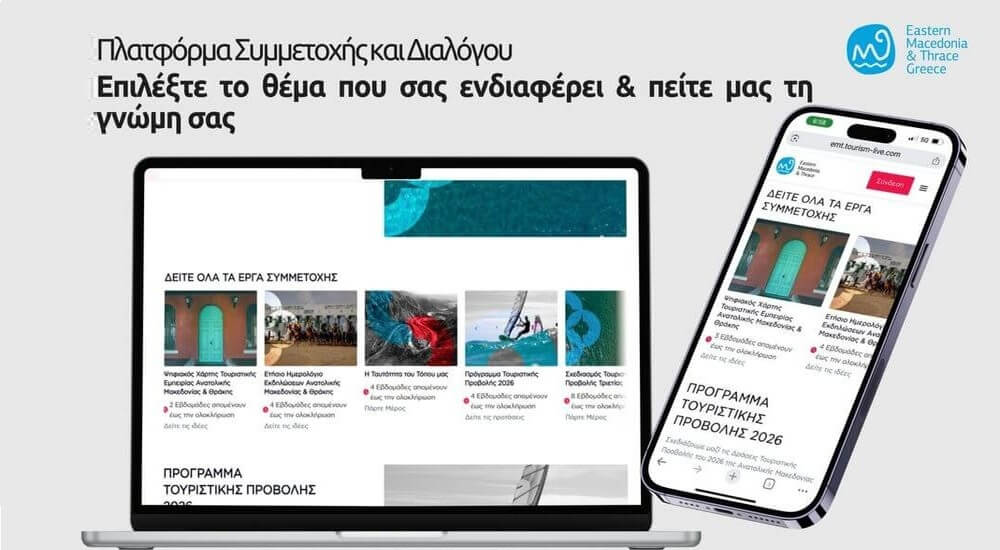 Η Περιφέρεια Ανατολικής Μακεδονίας και Θράκης θέτει σε εφαρμογή ένα νέο, ανοιχτό μοντέλο σχεδιασμού και διακυβέρνησης του τουρισμού, την Πλατφόρμα Συμμετοχής & Συνεργασίας Τουρισμού Tourism Live, στην οποία οι φορείς, οι εμπλεκόμενοι στο τουρισμό και η κοινωνία των πολιτών αποκτούν βήμα έκφρασης των ιδεών και προτάσεών τους.