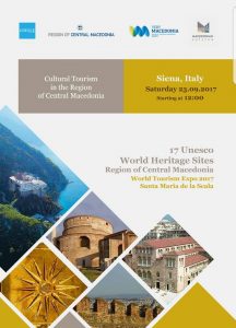 Στo πλαίσιο της διεθνούς έκθεσης «World Tourism Expo» για τον πολιτιστικό τουρισμό, που οργανώνει η UNESCO στις 22 – 24 Σεπτεμβρίου στη Σιένα της Ιταλίας, θα παρουσιαστεί για δεύτερη συνεχή χρονιά το πολιτιστικό απόθεμα της Περιφέρειας Κεντρικής Μακεδονίας, με έμφαση στα 17 μνημεία της που έχουν χαρακτηριστεί ως μνημεία Παγκόσμιας Πολιτιστικής Κληρονομιάς από την UNESCO.