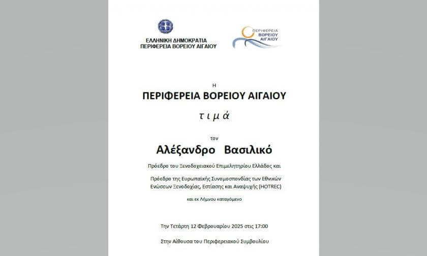 Η Περιφέρεια Βορείου Αιγαίου οργανώνει στις 12 Φεβρουαρίου 2025, εκδήλωση για να τιμήσει τον -εκ Λήμνου καταγόμενο- Αλέξανδρο Βασιλικό, Πρόεδρο του Ξενοδοχειακού Επιμελητηρίου Ελλάδας (ΞΕΕ) και Πρόεδρο της Ευρωπαϊκής Συνομοσπονδίας των Εθνικών Ενώσεων Ξενοδοχίας, Εστίασης και Αναψυχής (HOTREC).