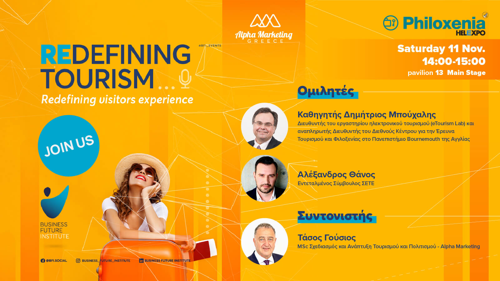 Στο πλαίσιο αυτό η Alpha Marketing σε συνεργασία με το Ινστιτούτο Επιχειρηματικού Μέλλοντος (Business Future Institute), διοργανώνει συζήτηση που θα επιδιώξει να δώσει πρακτικές απαντήσεις στα ερωτήματα πως επηρεάζονται οι δημόσιοι και ιδιωτικοί φορείς και οι τουριστικές επιχειρήσεις και τι ενέργειες απαιτούνται στο δυναμικά μεταλλασσόμενο περιβάλλον του τουρισμού που εξελίσσεται διαρκώς.