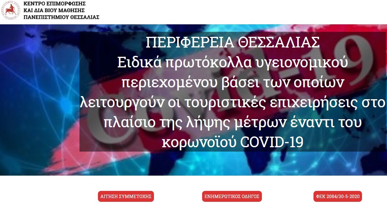Ξεκίνησε η λειτουργία της δωρεάν ηλεκτρονικής πλατφόρμας που δημιούργησε η Περιφέρειας Θεσσαλίας και το Κέντρο Επιμόρφωσης και Διά Βίου Μάθησης (Κ.Ε.ΔΙ.ΒΙ.Μ.) του Πανεπιστημίου Θεσσαλίας, με στόχο την εκπαίδευση εργαζομένων τουριστικών επιχειρήσεων στα πρωτόκολλα ασφαλείας υγειονομικού περιεχομένου έναντι του κορονοϊού COVID-19.