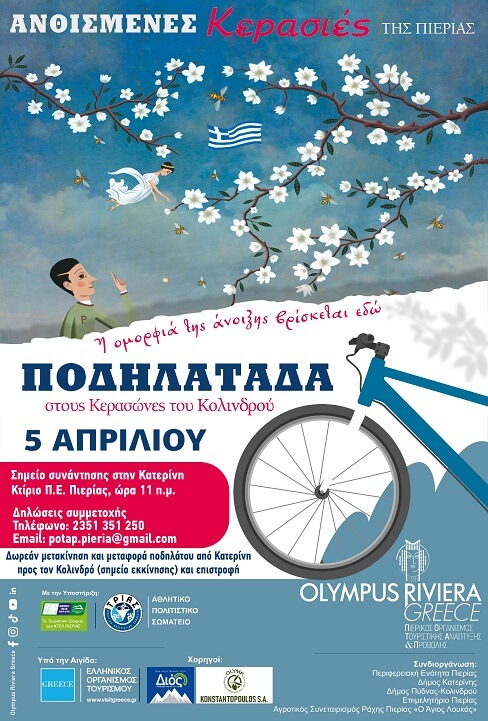 Την επόμενη ημέρα, Κυριακή 6 Απριλίου, οι ποδηλάτες και το ποδήλατο θα έχουν την τιμητική τους στις κερασοφόρες περιοχές της Ράχης Κατερίνης, με την «Ποδηλατική Απόδραση Πιερίας» να επιμελείται τα διαδικαστικά της διαδρομής, καλώντας σε συμμετοχή εκτός από τα μέλη και όσους επιθυμούν να ποδηλατήσουν ανάμεσα στις κερασιές και με φόντο τον Όλυμπο και τα Πιέρια.