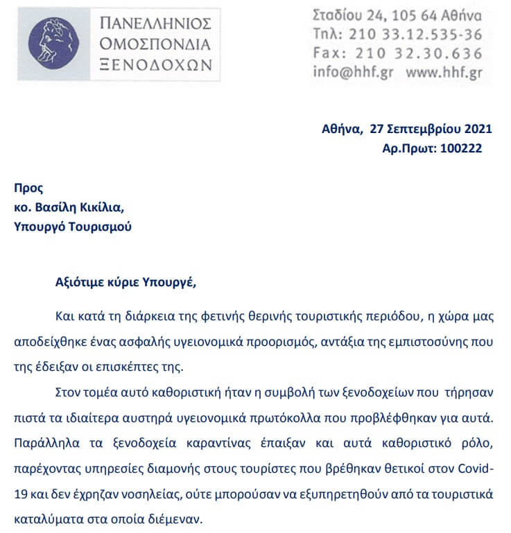 Η Πανελλήνια Ομοσπονδία Ξενοδόχων (ΠΟΞ), έστειλε επιστολή στον υπουργό Τουρισμού, Βασίλη Κικίλια, στην οποία ζητά να γίνουν αλλαγές – βελτιώσεις στα ισχύοντα υγειονομικά πρωτόκολλα, βάσει και της αλλαγής των καιρικών συνθηκών, που επιβάλλουν τη μεγαλύτερη, αν όχι αποκλειστική, χρήση εσωτερικών χώρων.