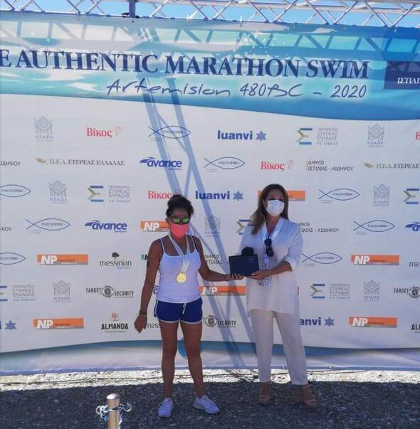 2η: Η Πρόεδρος του ΕΟΤ απονέμει το βραβείο στην παγκόσμια πρωταθλήτρια open water masters και πρώτη νικήτρια στις γυναίκες στον Αυθεντικό Μαραθώνιο Κολύμβησης, Βίκυ Κουβέλη.