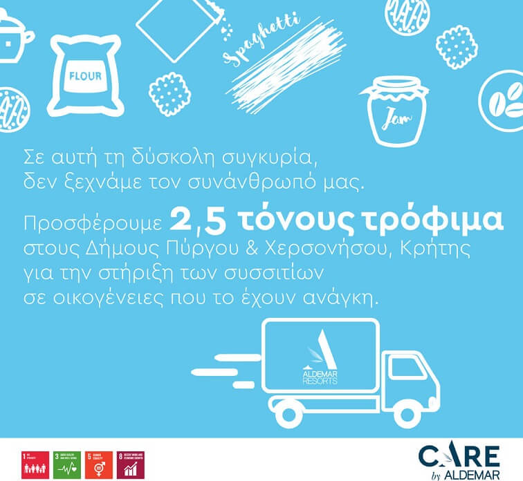 Ο Όμιλος Aldemar Resorts σε μια ελάχιστη πράξη συμπαράστασης για τις πρωτοφανείς συνθήκες που βιώνει η κοινωνία μας, προχωρά σε μια σειρά δράσεων στήριξης των ασθενέστερων ομάδων και συνανθρώπων μας, στοχεύοντας στην κάλυψη των άμεσων αναγκών σίτισης και σε κάλυψη βασικών αναγκών της Δημόσιας Υγείας.