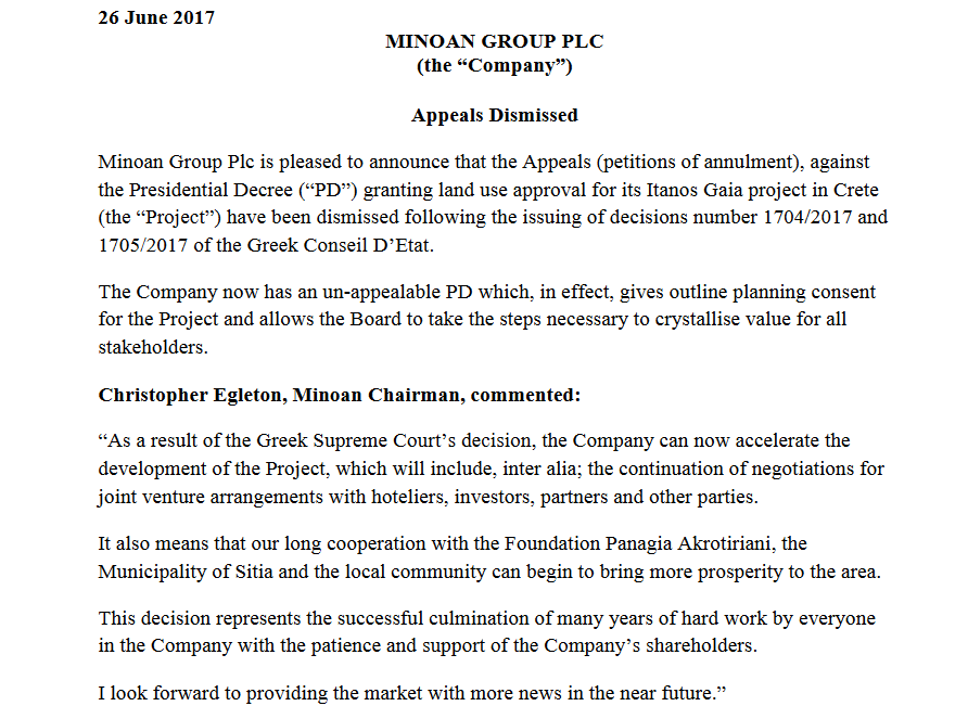 Σύμφωνα με τον Christopher Egleton, πρόεδρο της Minoan, «η εταιρεία μπορεί πλέον να επιταχύνει τις διαδικασίες για την ανάπτυξη του έργου και να συνεχίσει τις διαπραγματεύσεις για joint venture συνεργασίες με ξενοδοχειακούς ομίλους και άλλους επενδυτές. Η απόφαση αυτή είναι το ευτυχές αποκορύφωμα πολλών χρόνων σκληρής δουλειάς όλων στην εταιρεία, με την υπομονή και την υποστήριξη των μετόχων της εταιρείας».