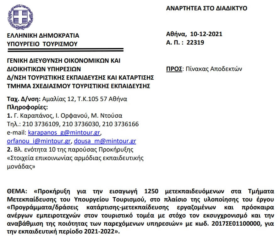 Η προκήρυξη εισαγωγής 1.250 μετεκπαιδευόμενων στα τμήματα του Υπουργείου Τουρισμού