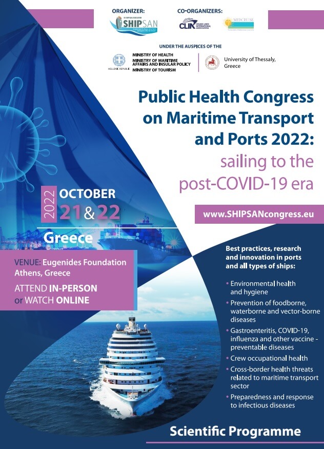 Η Ευρωπαϊκή Επιστημονική Ένωση για την Υγεία και την Υγιεινή στις Θαλάσσιες Μεταφορές «EU SHIPSAN» συνδιοργανώνει με τη Διεθνή Ένωση Εταιρειών Κρουαζιέρας (CLIA) και την Ένωση των Μεσογειακών Λιμένων Κρουαζιέρας (MedCruise), το πρώτο διεθνές συνέδριο δημόσιας υγείας στη ναυτιλία και στους λιμένες με τίτλο «Public Health Congress 2022 on Maritime Transport and Ports: sailing to the post-COVID-19 era», στις 21 – 22 Οκτωβρίου 2022 στο Ίδρυμα Ευγενίδου, στην Αθήνα.