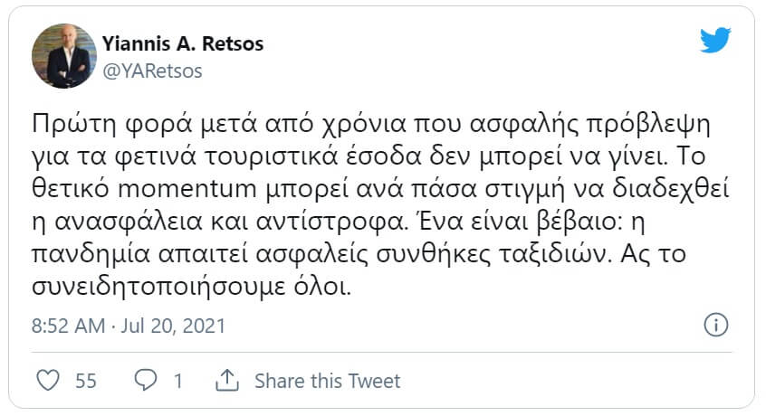 Τα παραπάνω έγραψε χθες (20/07) στο Twitter, ο πρόεδρος του Συνδέσμου Ελληνικών Τουριστικών Επιχειρήσεων (ΣΕΤΕ), Γιάννης Ρέτσος.