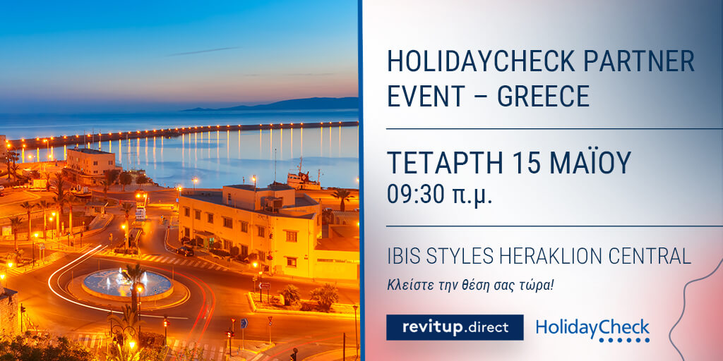 Από τη RevitUp.direct, το πολυβραβευμένο Revenue Management & Digital Marketing Αgency στον κλάδο της φιλοξενίας, ανακοινώθηκε η συμμετοχή της στην εκδήλωση της HolidayCheck, ως αποκλειστικός συνεργάτης στην Ελλάδα.