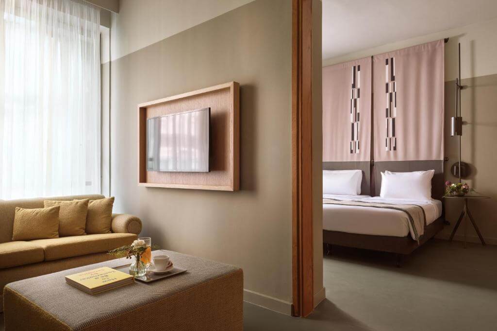 Στους κοινόχρηστους χώρους, επιλέχθηκαν υλικά όπως μάρμαρο από τη Βόρεια Ελλάδα, ξύλο και μια tailor-made μοκέτα που παραπέμπει στα κεφαλάρια των κρεβατιών, προσφέροντας μια οπτική συνέχεια και ζεστή ατμόσφαιρα.