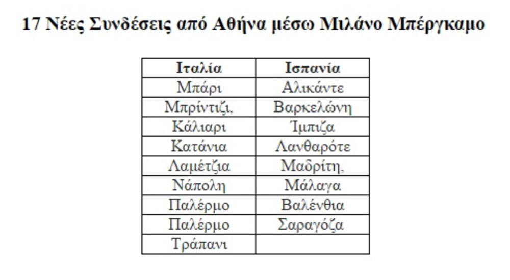 Συγκεκριμένα, οι επιβάτες από Αθήνα θα έχουν τη δυνατότητα να συνδέονται μέσω Μιλάνου με τους εξής προορισμούς σε Ισπανία και Ιταλία: Αλικάντε, Βαλένθια, Βαρκελώνη, Ίμπιζα, Κάλιαρι, Κατάνια, Λαμέτζια, Λανθαρότε, Μαδρίτη, Μάλαγα, Μπάρι, Μπρίντιζι, Νάπολη, Παλέρμο, Πεσκάρα, Σαραγόσα και Τράπανι.