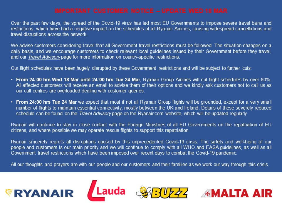 Η Ryanair στην ανακοίνωση της αναφέρει ότι από απόψε το βράδυ θα διακόψει πάνω από το 80% των πτήσεων της και ότι οι πελάτες της θα ενημερωθούν με e-mails, ενώ από τις 24 Μαρτίου σχεδόν όλες οι πτήσεις θα ανασταλούν, εκτός από ένα πολύ μικρό αριθμό πτήσεων που θα πραγματοποιούνται μεταξύ της Βρετανίας και της Ιρλανδίας.