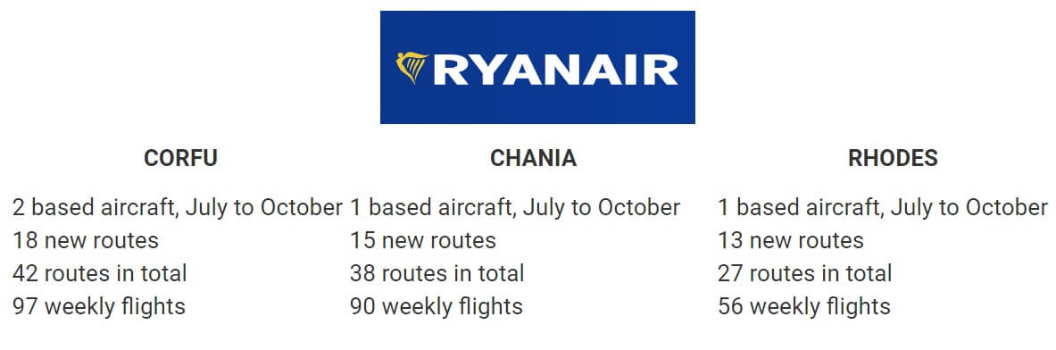 H αεροπορική εταιρεία χαμηλού κόστους Ryanair, ανακοίνωσε τη δημιουργία τριών επιπλέον βάσεων στα αεροδρόμια της Ρόδου (με ένα αεροπλάνο), των Χανίων (με ένα αεροπλάνο) και της Κέρκυρας (με δύο αεροπλάνα), προσφέροντας συνολικά 107 δρομολόγια, εκ των οποίων τα 46 είναι καινούργια και 243 πτήσεις κάθε εβδομάδα.