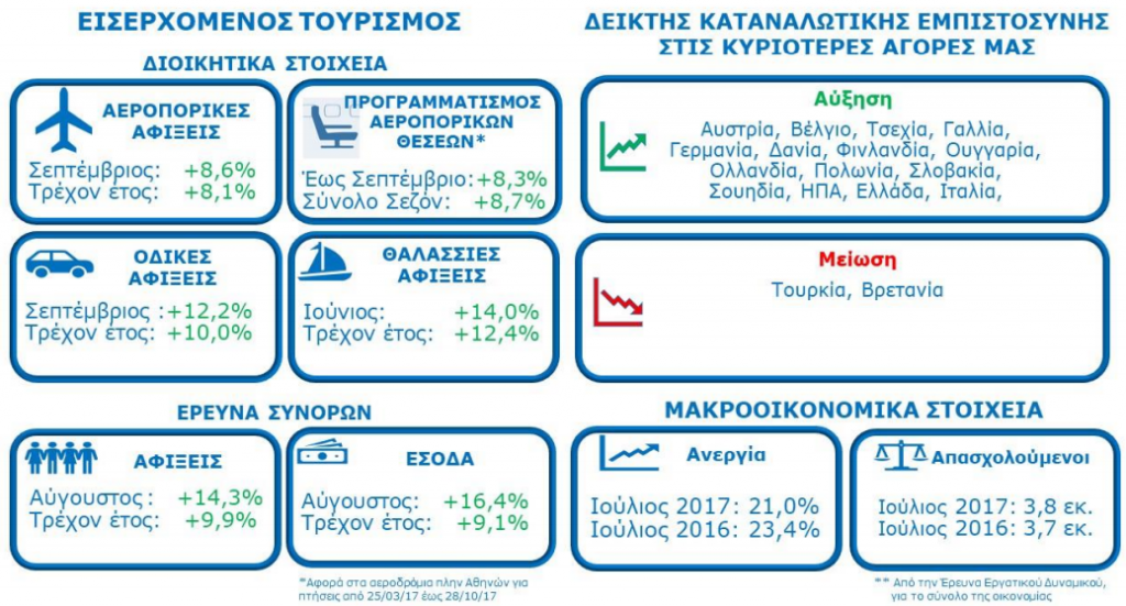 Τα σημαντικότερα συμπεράσματα από το Στατιστικό Δελτίο Νο. 34 – Οκτώβριος 2017, του Ινστιτούτου του Συνδέσμου Ελληνικών Τουριστικών Επιχειρήσεων (ΣΕΤΕ), είναι τα παρακάτω:
