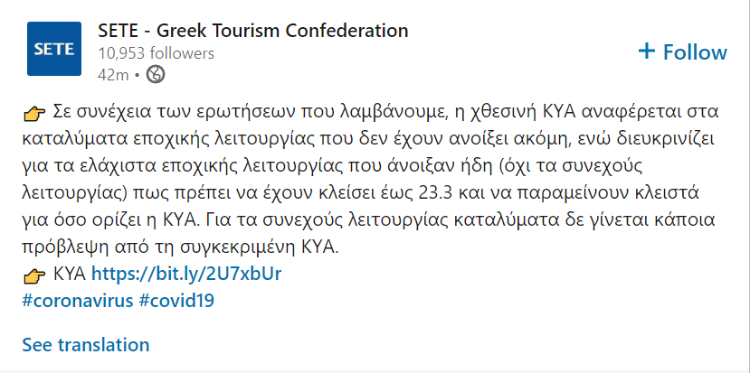 «Σε συνέχεια των ερωτήσεων που λαμβάνουμε, η χθεσινή ΚΥΑ (δείτε ΕΔΩ), αναφέρεται στα καταλύματα εποχικής λειτουργίας που δεν έχουν ανοίξει ακόμη, ενώ διευκρινίζει για τα ελάχιστα εποχικής λειτουργίας που άνοιξαν ήδη (όχι τα συνεχούς λειτουργίας) πως πρέπει να έχουν κλείσει έως 23/03 και να παραμείνουν κλειστά για όσο ορίζει η ΚΥΑ.