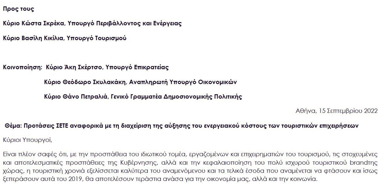 Θέμα: Προτάσεις ΣΕΤΕ αναφορικά με τη διαχείριση της αύξησης του ενεργειακού κόστους των τουριστικών επιχειρήσεων