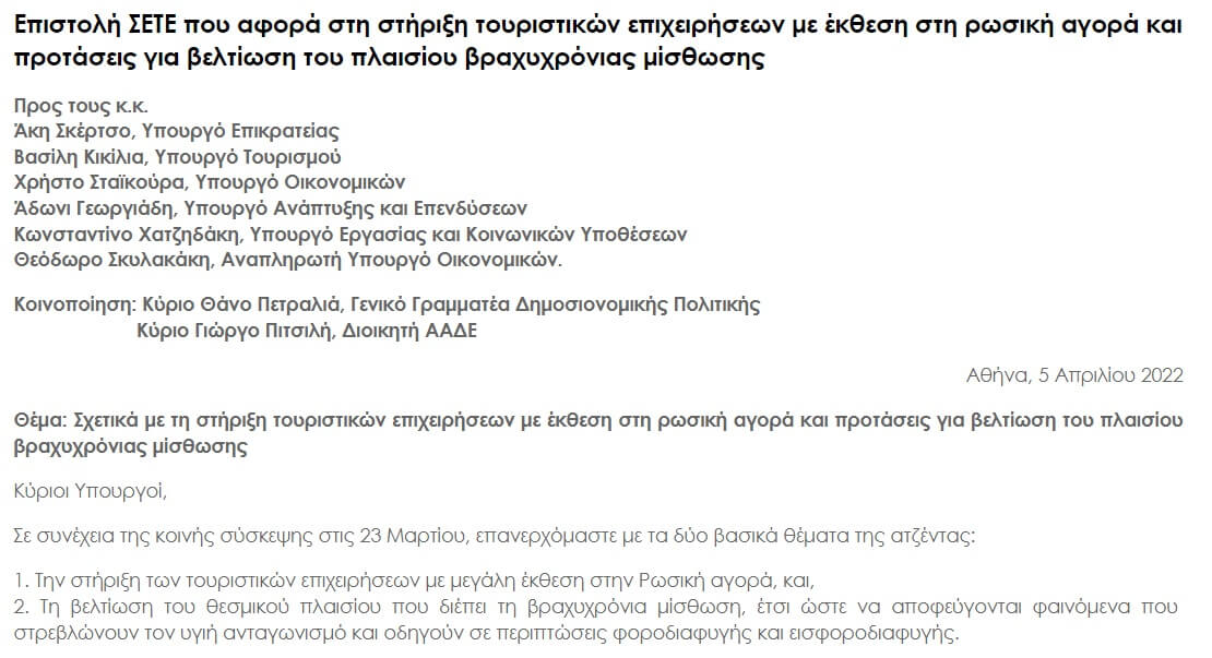 Ο Πρόεδρος του Συνδέσμου Ελληνικών Τουριστικών Επιχειρήσεων (ΣΕΤΕ), έστειλε επιστολή στους αρμόδιους Υπουργούς με θέματα τη στήριξη των τουριστικών επιχειρήσεων με έκθεση στη ρωσική αγορά και προτάσεις για τη βελτίωση του θεσμικού πλαισίου που διέπει τη βραχυχρόνια μίσθωση, έτσι ώστε να αποφεύγονται φαινόμενα που στρεβλώνουν τον υγιή ανταγωνισμό και οδηγούν σε περιπτώσεις φοροδιαφυγής και εισφοροδιαφυγής.