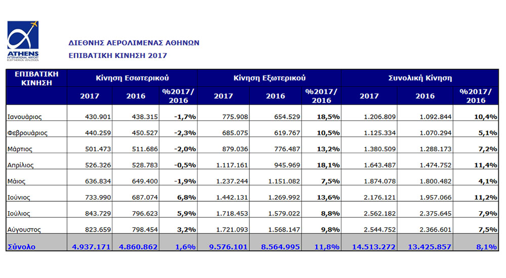 Την περίοδο Ιανουαρίου – Αυγούστου 2017, η επιβατική κίνηση του αεροδρομίου της Αθήνας έφθασε τα 14.513.272, έναντι 13.425.857 την ίδια περίοδο του 2016 (αύξηση 8,1%).