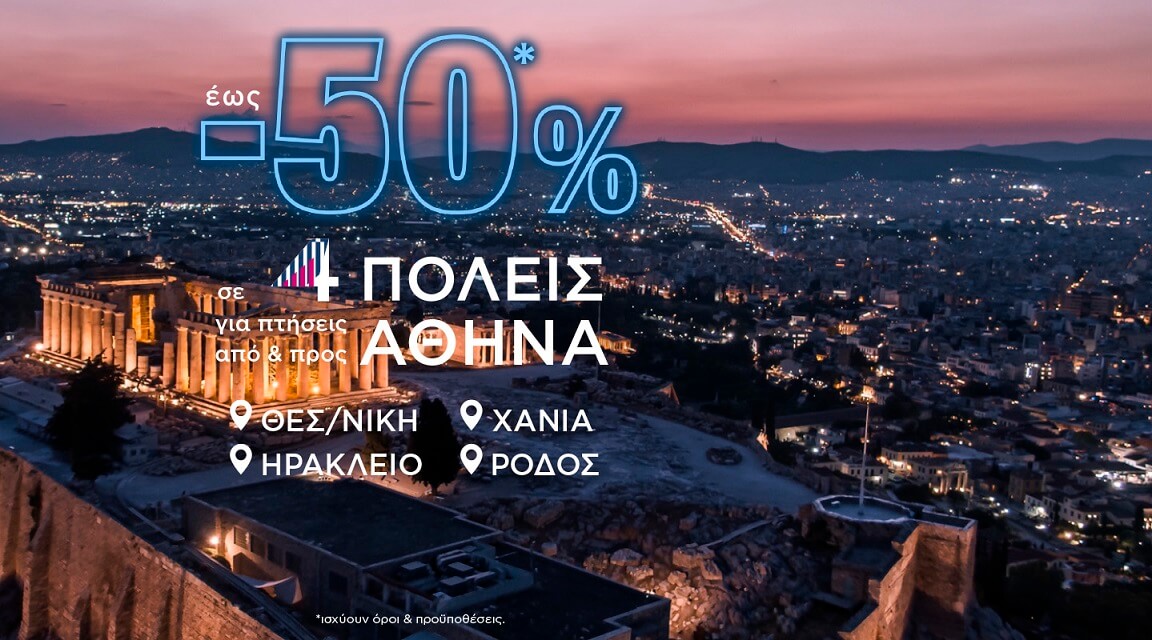 Η SKY express ανακοίνωσε ότι προσφέρει έκπτωση έως 50% για πτήσεις από και προς το αεροδρόμιο της Αθήνας με προορισμό τη Θεσσαλονίκη, τη Ρόδο, το Ηράκλειο και τα Χανιά.