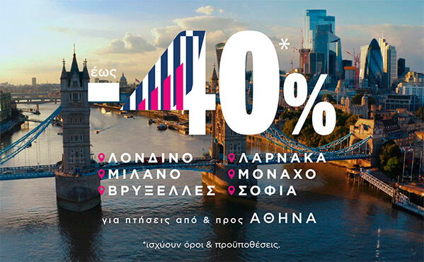 Ισχύει για Λονδίνο, Λάρνακα, Μιλάνο, Μόναχο, Σόφια, Βρυξέλλες, για απευθείας πτήσεις, χωρίς ενδιάμεσο σταθμό από και προς Αθήνα.