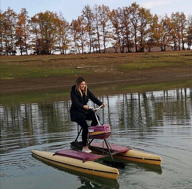 Η κα Ζαχαράκη δεν έχασε την ευκαιρία να επιδοθεί και σε εναλλακτικές αθλητικές δραστηριότητες, κάνοντας υδροποδήλατο μέσα στη λίμνη (φωτογραφία).