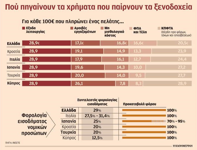 Για κάθε 100 ευρώ που πληρώνει ένας πελάτης ξενοδοχείου στην Ελλάδα μόνο 20,5 ευρώ μένουν τελικά στην επιχείρηση για να πληρώσει φόρους εταιρικών κερδών και να εξυπηρετήσει τη χρηματοδότηση της επένδυσης, υποχρεώσεις που είναι οι υψηλότερες μεταξύ των ανταγωνιστών της, καθώς το αντίστοιχο προ φόρων ποσό είναι σχεδόν κατά 35% υψηλότερο στην Τουρκία (27,7 ευρώ) και την Ισπανία (27,2 ευρώ).