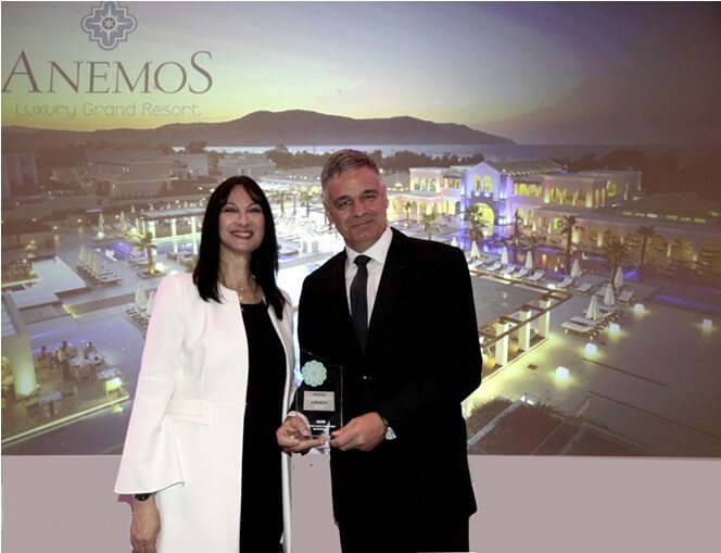 Το ξενοδοχείο «ANEMOS LUXURY GRAND RESORT» σε μια λαμπρή τελετή, παρουσία στελεχών της ελληνικής ξενοδοχίας και επισήμων, βραβεύτηκε στην κατηγορία «TOP GREEK RESORT 2019», στην απονομή των βραβείων «Greek Hospitality Awards 2019».