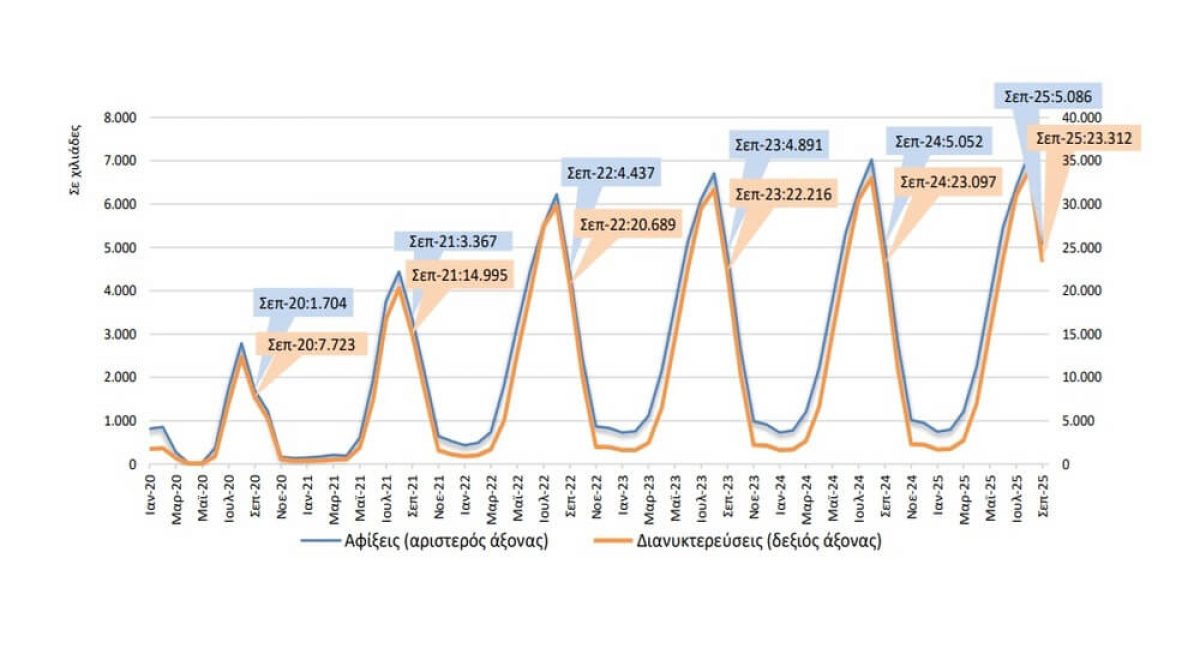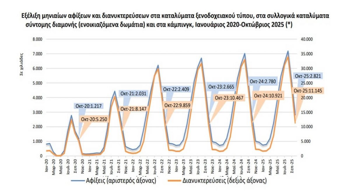 Στο σύνολο των επιχειρήσεων του κλάδου των Καταλυμάτων, ο κύκλος εργασιών το δεύτερο τρίμηνο 2025 ανήλθε σε 2.976.884.000 ευρώ, σημειώνοντας αύξηση 2,6% σε σχέση με το δεύτερο τρίμηνο 2024, όπου είχε ανέλθει σε 2.901.746.000 ευρώ.