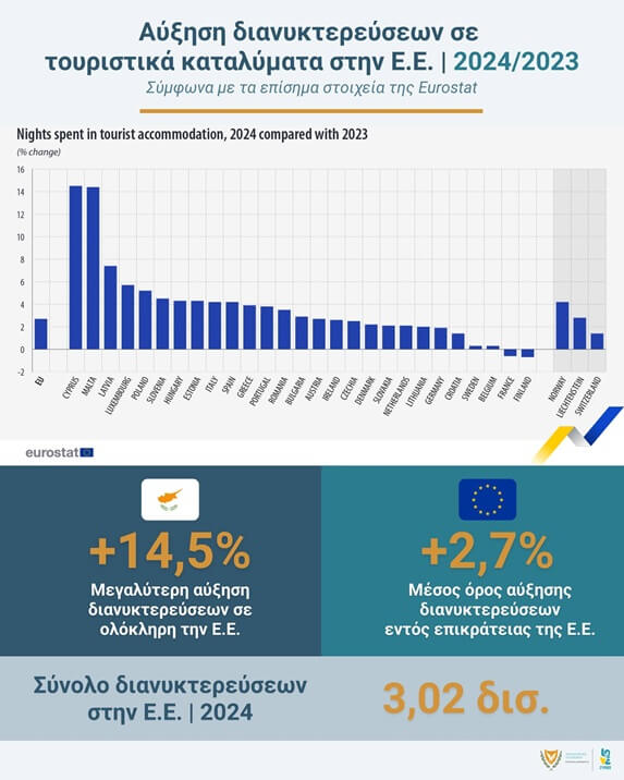 Η Κύπρος κατατάσσεται στην 1η θέση των χωρών της Ε.Ε. με αύξηση των διανυκτερεύσεων μεταξύ των ετών 2024 και 2023, ύψους 14,5%.