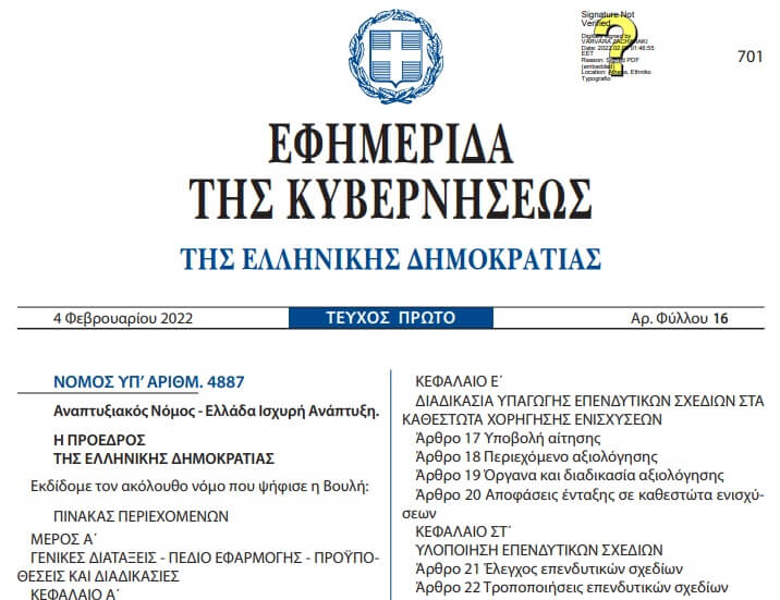 Δημοσιεύθηκε στο ΦΕΚ 16 Α’ ο νέος αναπτυξιακός νόμος Ν.4887/2022 με τίτλο: «Αναπτυξιακός Νόμος – Ελλάδα Ισχυρή Ανάπτυξη».