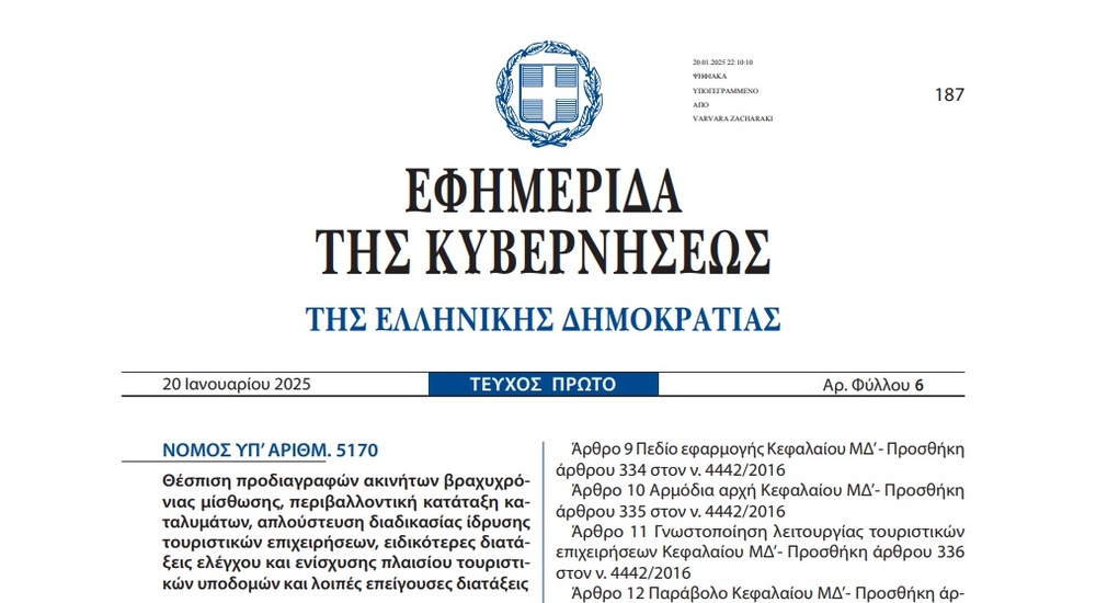 Δημοσιεύθηκε την προηγούμενη βδομάδα στο Φύλλο Εφημερίδας της Κυβέρνησης (ΦΕΚ), ο νέος νόμος (5170/2025) του Υπουργείου Τουρισμού, που ψηφίστηκε πριν από λίγες ημέρες στη Βουλή, με τίτλο: «Θέσπιση προδιαγραφών ακινήτων βραχυχρόνιας μίσθωσης, περιβαλλοντική κατάταξη καταλυμάτων, απλούστευση διαδικασίας ίδρυσης τουριστικών επιχειρήσεων, ειδικότερες διατάξεις ελέγχου και ενίσχυσης πλαισίου τουριστικών υποδομών και λοιπές επείγουσες διατάξεις».