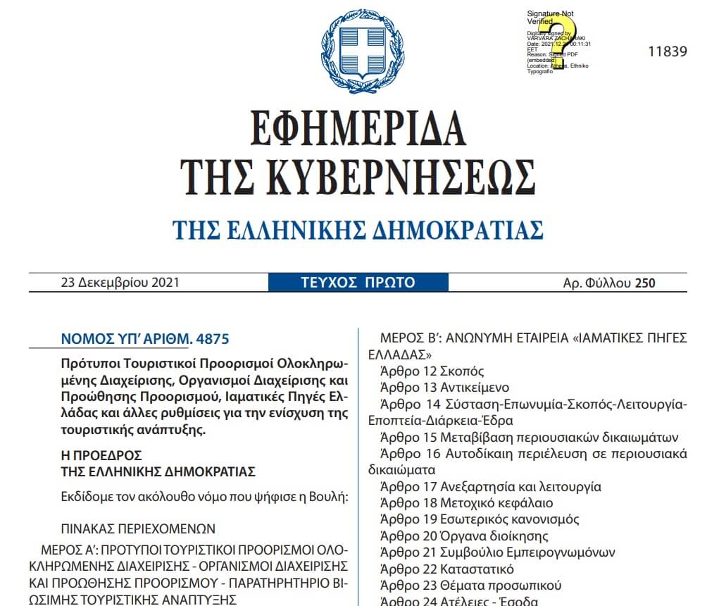Δημοσιεύθηκε στο ΦΕΚ 250 Α’ 23.12.2021, ο νέος τουριστικός νόμος Ν.4875/2021 με τίτλο: «Πρότυποι Τουριστικοί Προορισμοί Ολοκληρωμένης Διαχείρισης, Οργανισμοί Διαχείρισης και Προώθησης Προορισμού, Ιαματικές Πηγές Ελλάδας και άλλες ρυθμίσεις για την ενίσχυση της τουριστικής ανάπτυξης».
