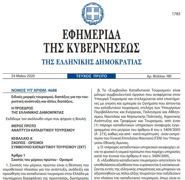 Δημοσιεύθηκε στο ΦΕΚ ο νόμος 4688/2020, του υπουργείου Τουρισμού, για τις ειδικές μορφές τουρισμού.