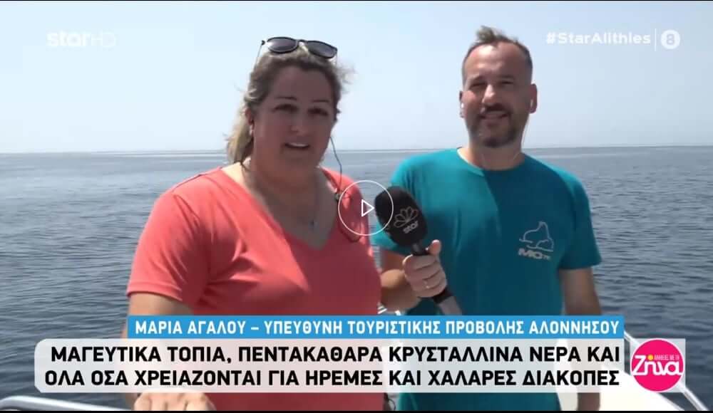 Στο πλαίσιο του προγράμματος τουριστικής προβολής του Δήμου Αλοννήσου, τριμελές τηλεοπτικό συνεργείο της τηλεοπτικής εκπομπής «Αλήθειες με τη Ζήνα» του STAR, φιλοξενήθηκε στην εξωτική γωνιά των Σποράδων και ξεναγήθηκε στην Παλιά Αλόννησο, το Πατητήρι, σε παραθαλάσσια χωριά και σε πολλές από τις μαγευτικές παραλίες του νησιού με προσωπική φροντίδα της Προέδρου της Επιτροπής Τουρισμού του Δήμου, Μαρίας Αγάλλου.