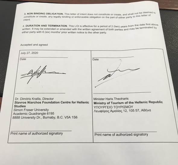 Μνημόνιο συνεργασίας υπέγραψε το Υπουργείο Τουρισμού με το Κέντρο Ελληνικών Σπουδών του Ιδρύματος Σταύρος Νιάρχος, στο Πανεπιστήμιο Simon Fraser της Βρετανικής Κολομβίας, στον Καναδά.