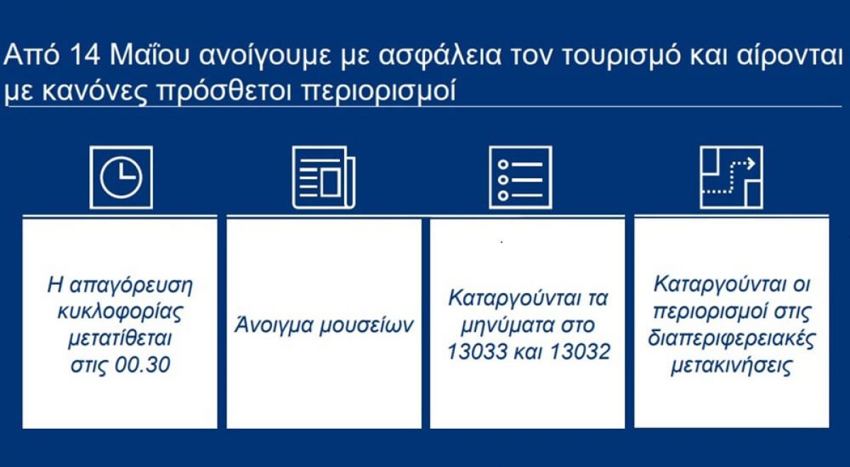 Τη στρατηγική της κυβέρνησης για το πέρασμα της ελληνικής κοινωνίας στην καλοκαιρινή περίοδο, παρουσίασε χθες (12/05), ο υφυπουργός παρά τω πρωθυπουργώ  Άκης Σκέρτσος. Μεταξύ άλλων, ο κ. Σκέρτσος ανακοίνωσε ότι: Aπό τις 14 Μαΐου, η χώρα μας ανοίγει για τον τουρισμό, ενώ από την ίδια ημερομηνία η