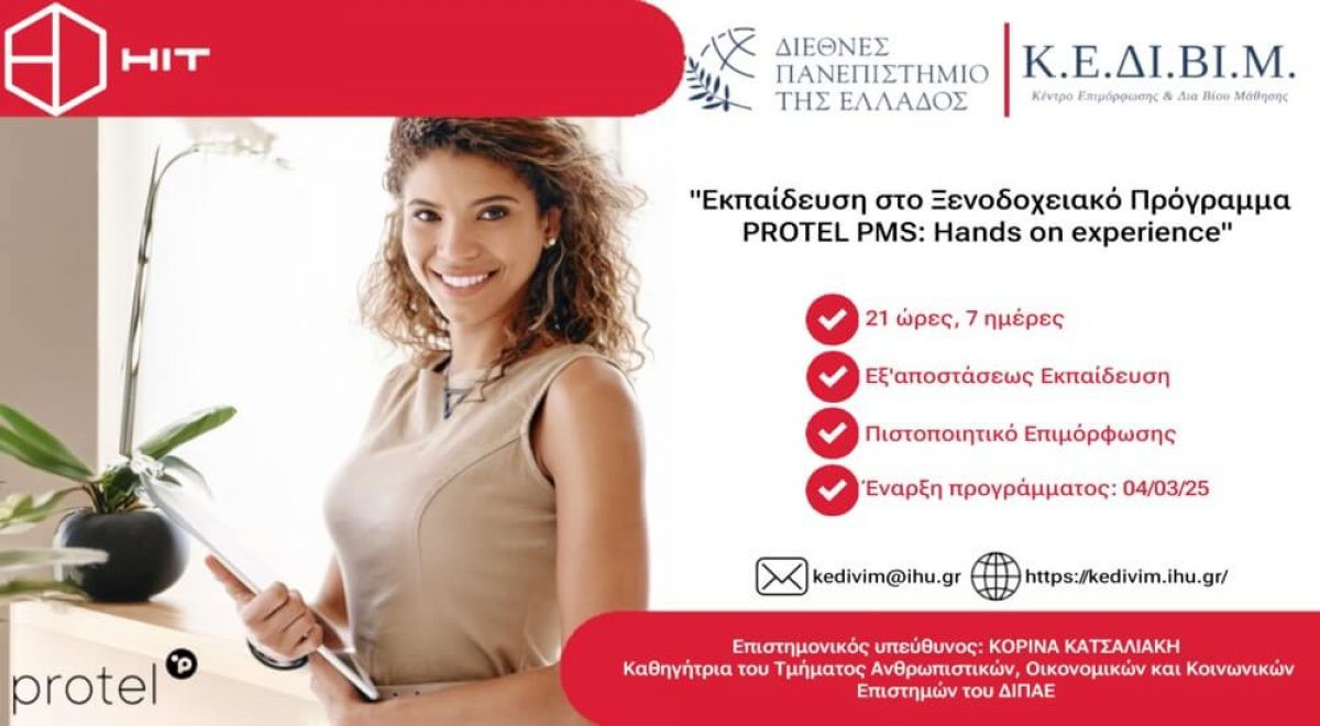 Το Κέντρο Διά Βίου Μάθησης του Διεθνούς Πανεπιστημίου της Ελλάδος (ΔΙΠΑΕ), ανακοίνωσε την έναρξη πιστοποιημένων σεμιναρίων με πρακτική εκπαίδευση στο ξενοδοχειακό πρόγραμμα Protel PMS. Το πρόγραμμα περιλαμβάνει 21 ώρες online σύγχρονης εκπαίδευσης, προσφέροντας στους συμμετέχοντες μια ολοκληρωμένη εμπειρία χρήσης του κορυφαίου συστήματος διαχείρισης ξενοδοχείων. [bsa_pro_ad_space id=6] Απευθύνεται σε: •