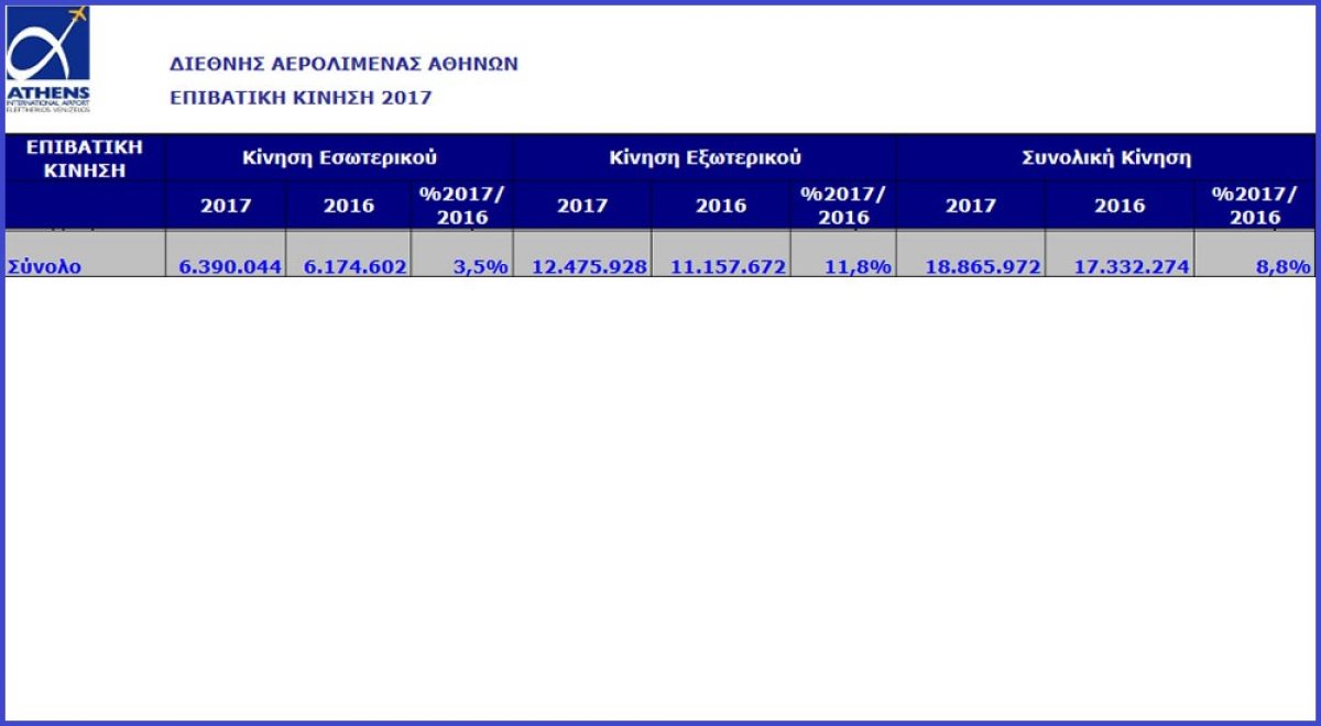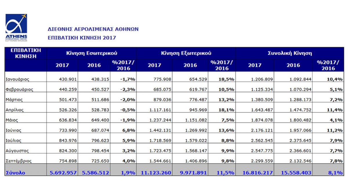 Την περίοδο Ιανουαρίου - Οκτωβρίου του 2017, η κίνηση του αεροδρομίου της Αθήνας έφθασε τα 18.865.972 επιβάτες, σημειώνοντας αύξηση 8,8% σε σχέση με το ίδιο διάστημα του 2016 (17.332.274 επιβάτες). Η αύξηση αυτή οφείλεται στην άνοδο της διεθνούς κίνησης κατά 11,8% και της κίνησης εσωτερικού κατά