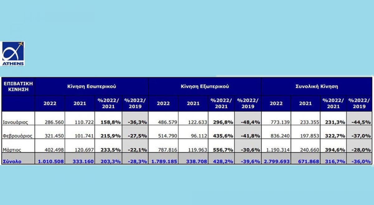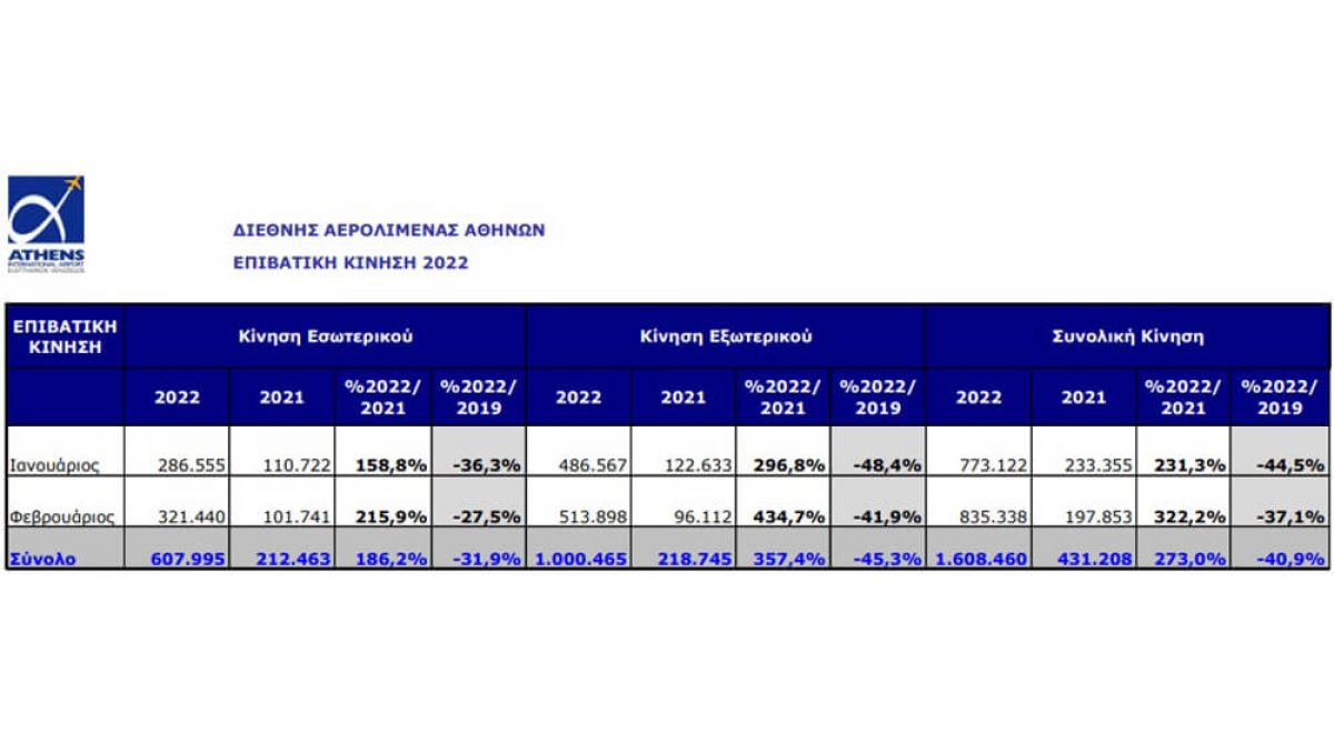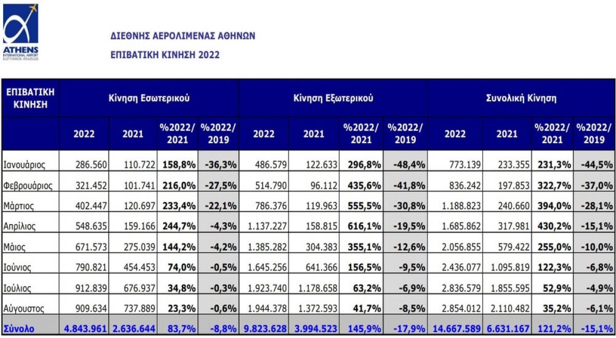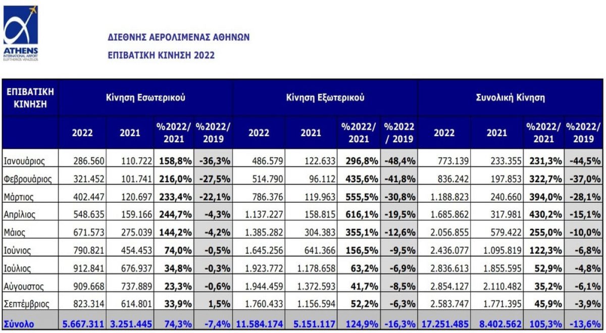 Τους πρώτους εννέα μήνες (Ιανουάριος - Σεπτέμβριος) του 2022, η επιβατική κίνηση του αεροδρομίου της Αθήνας άγγιξε τα 17,3 εκατ. και παρέμεινε μειωμένη κατά 13,6% σε σύγκριση με το ίδιο διάστημα του 2019. Οι επιβάτες εσωτερικού παρέμειναν κάτω από τα επίπεδα του 2019 κατά 7,4%, ενώ