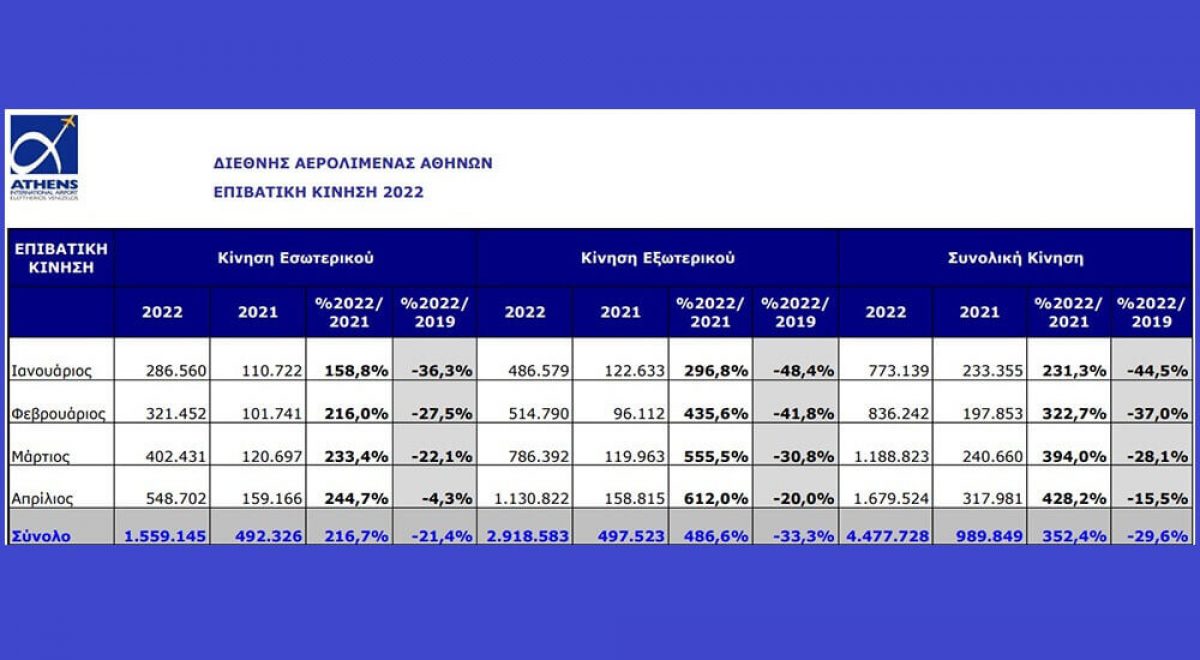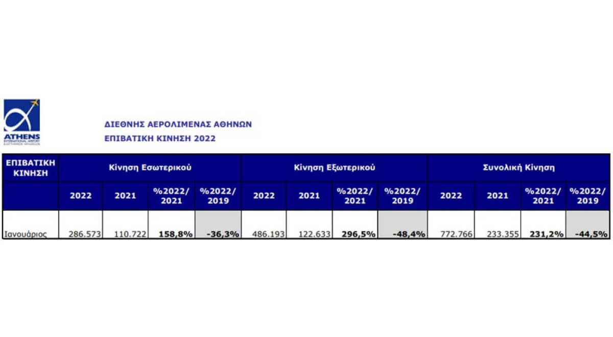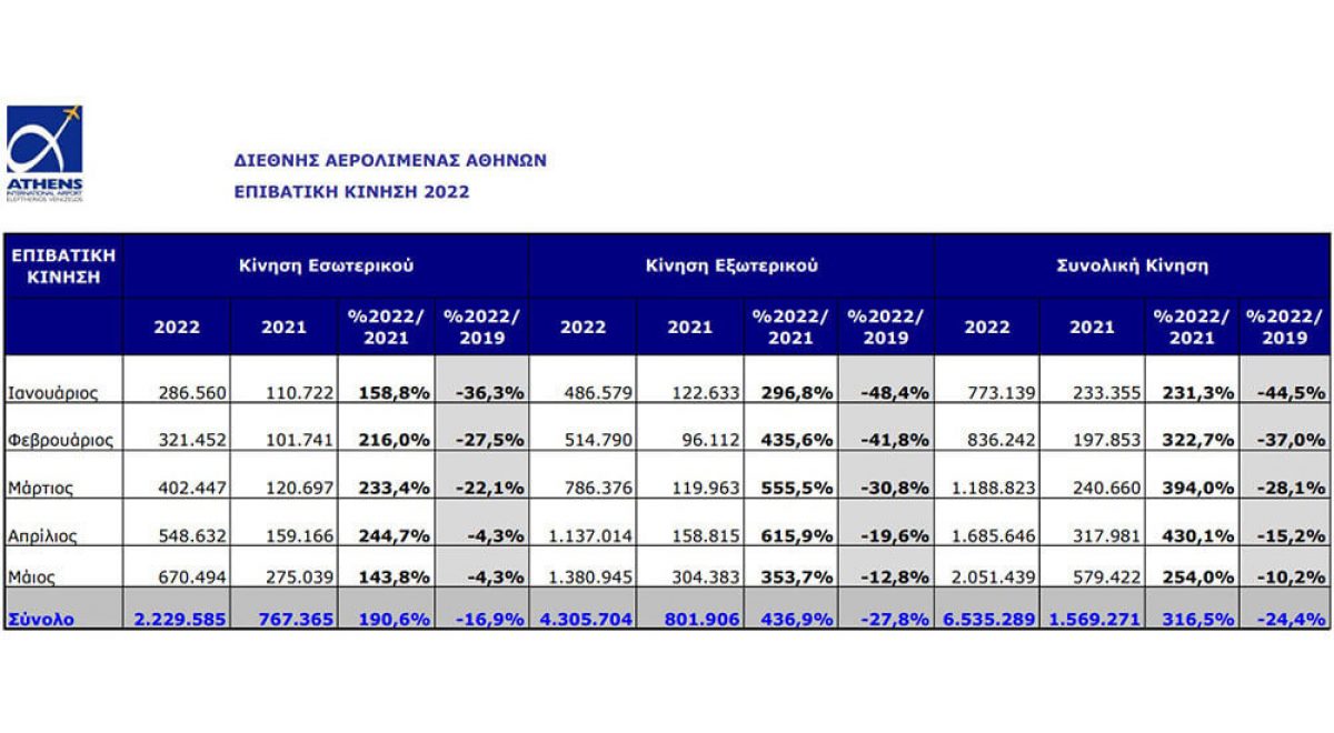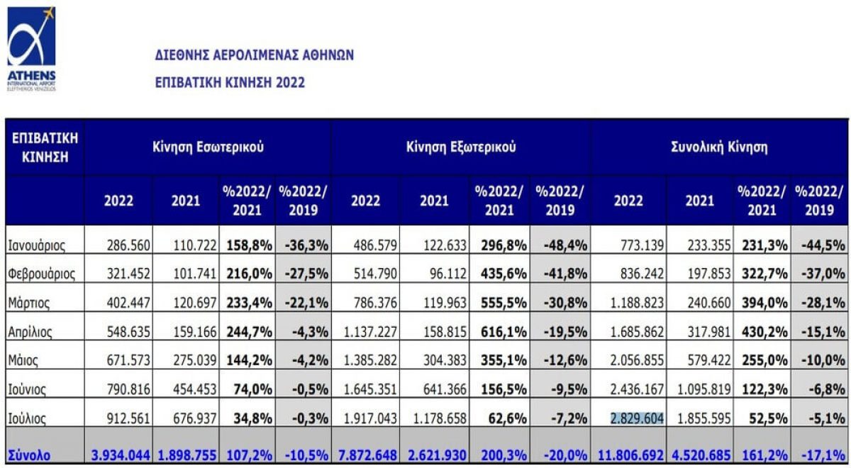 Τους πρώτους εννέα μήνες (Ιανουάριος - Σεπτέμβριος) του 2022, η επιβατική κίνηση του αεροδρομίου της Αθήνας άγγιξε τα 17,3 εκατ. και παρέμεινε μειωμένη κατά 13,6% σε σύγκριση με το ίδιο διάστημα του 2019. Οι επιβάτες εσωτερικού παρέμειναν κάτω από τα επίπεδα του 2019 κατά 7,4%, ενώ