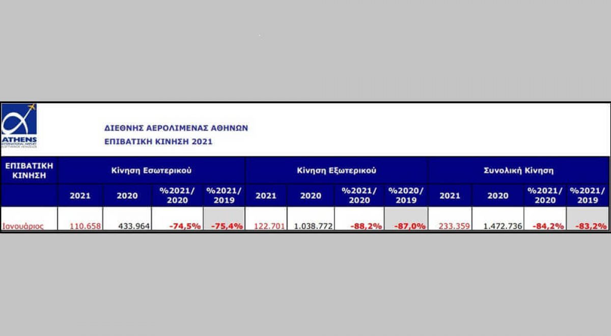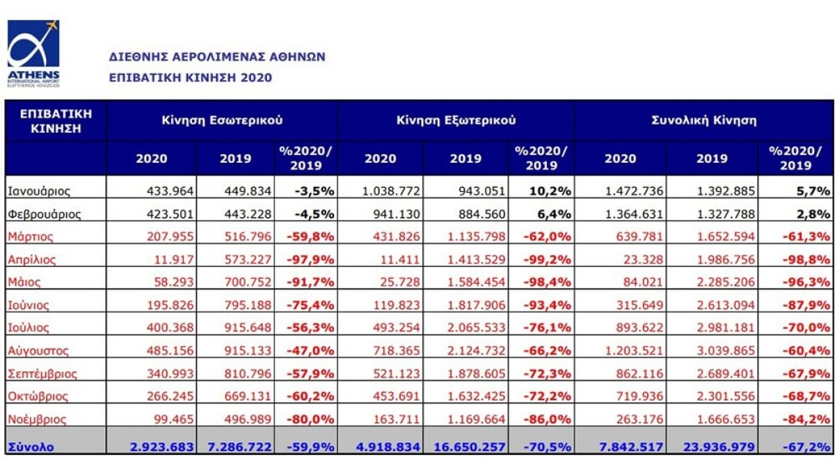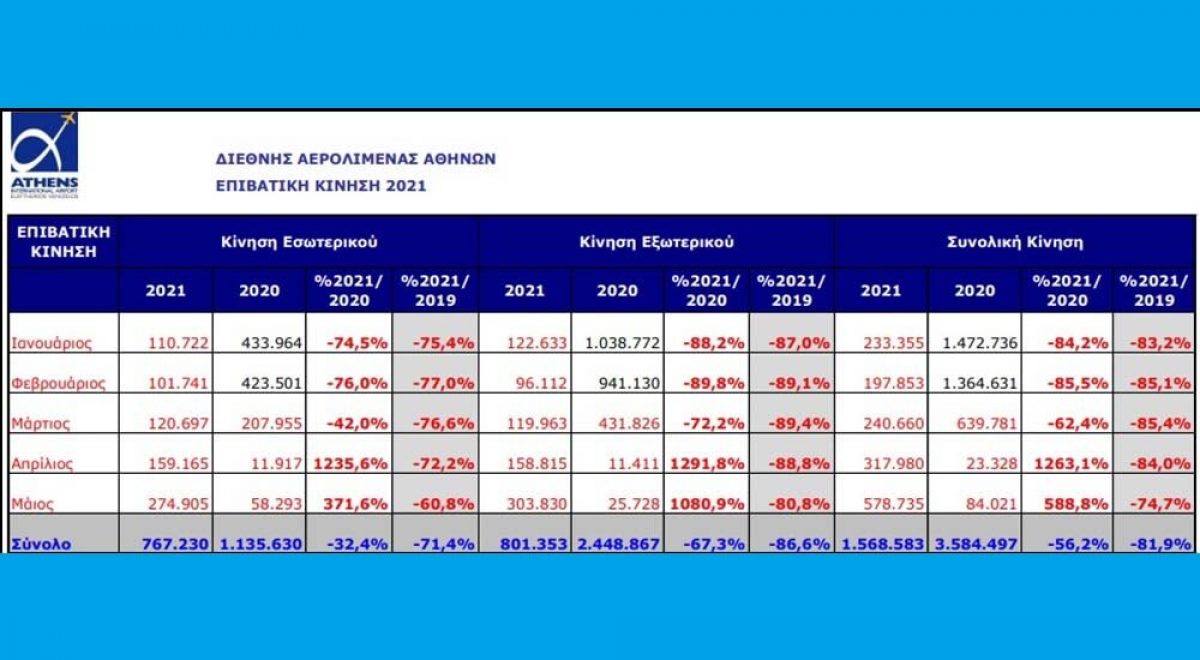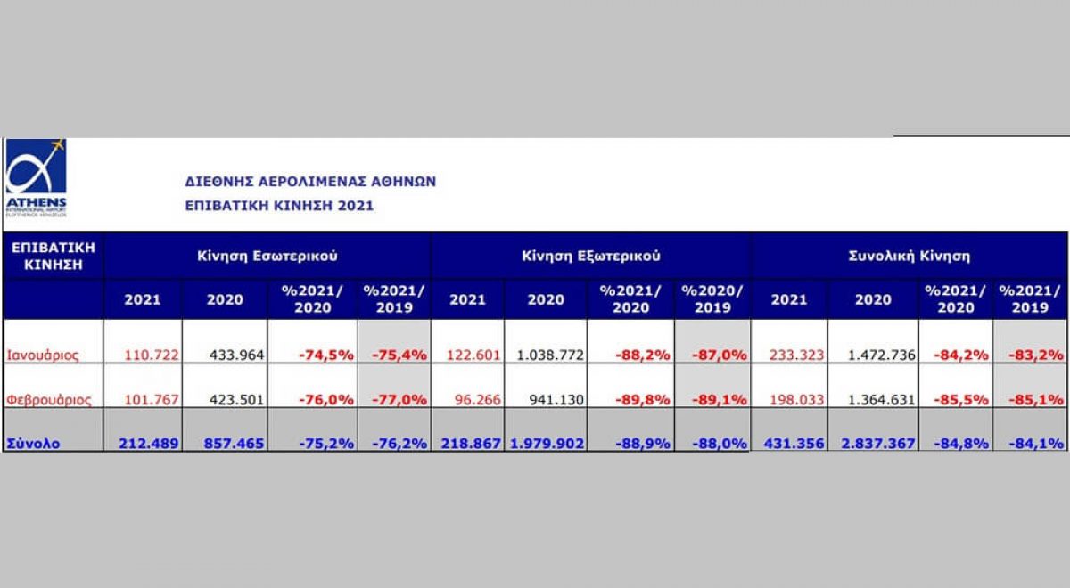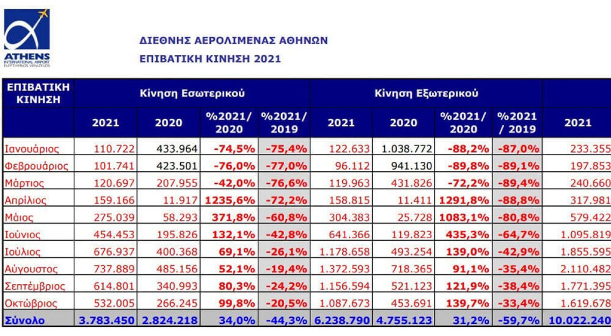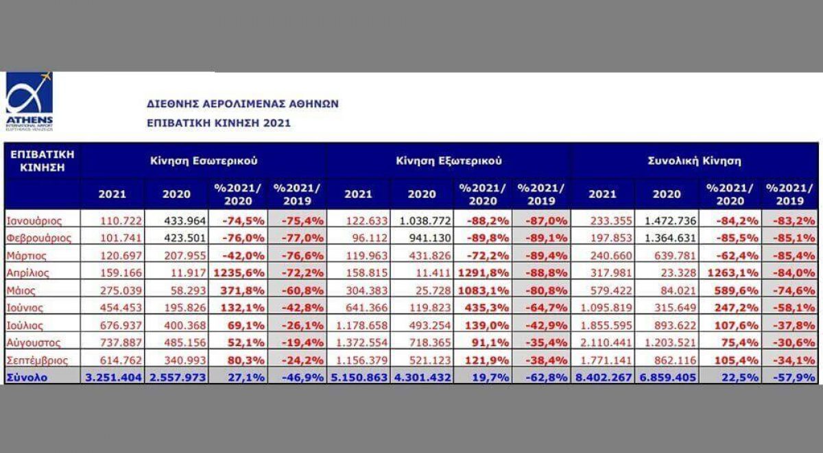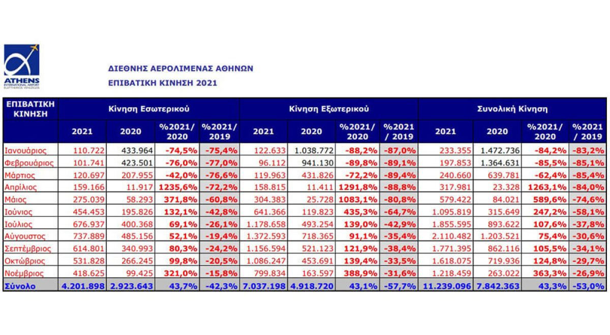 Την περίοδο Ιανουαρίου - Νοεμβρίου του 2021, η κίνηση του αεροδρομίου της Αθήνας ανήλθε σε 11.239.096 επιβάτες και, αν και ξεπέρασε τις επιδόσεις της αντίστοιχης περιόδου του 2020 κατά 43,3%, παρέμεινε μειωμένη σε σύγκριση το ίδιο διάστημα του 2019 κατά 53%. Σε σύγκριση με το 2020, οι επιβάτες