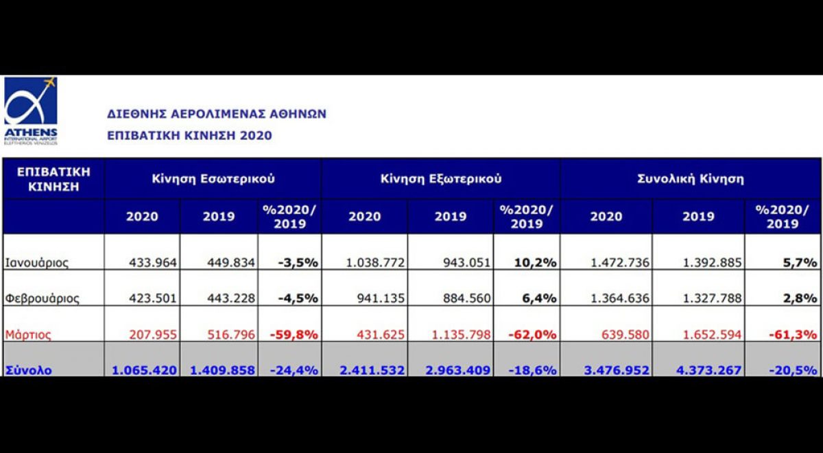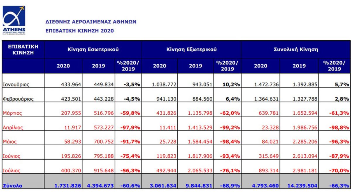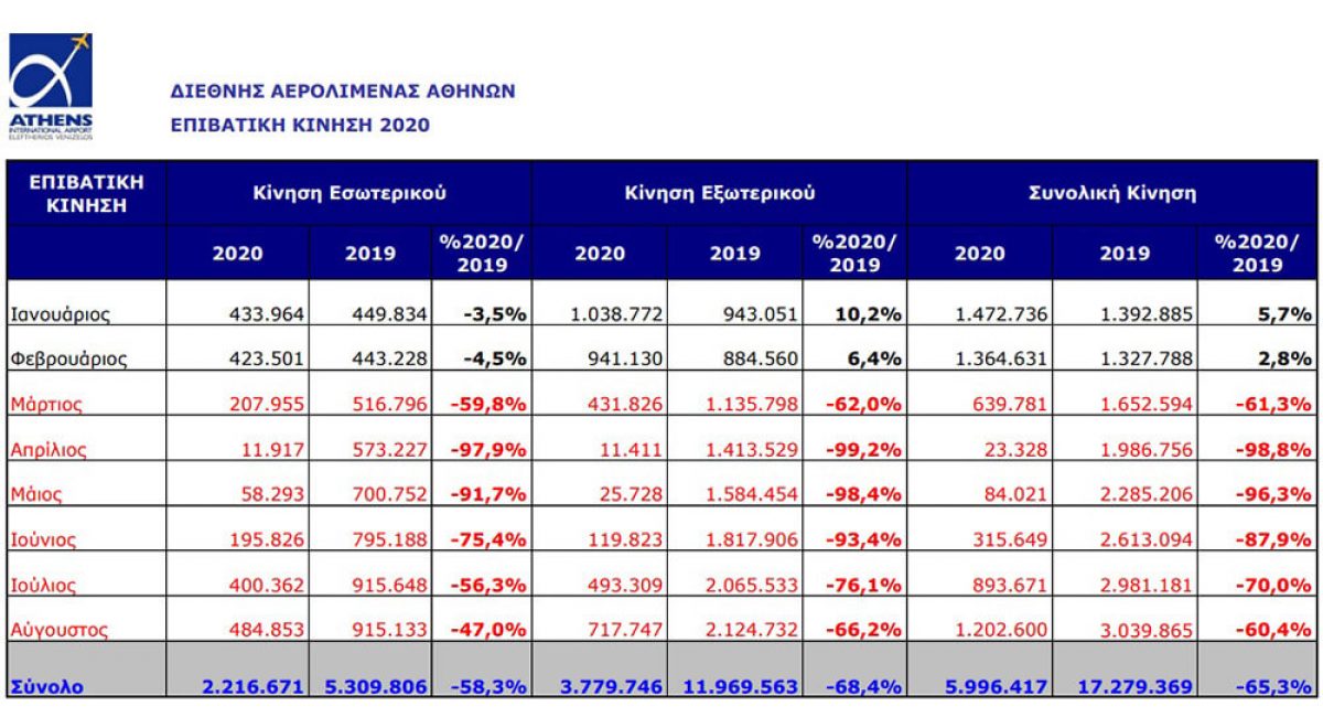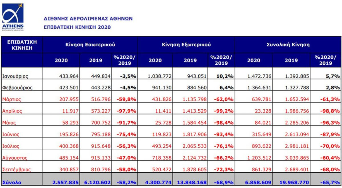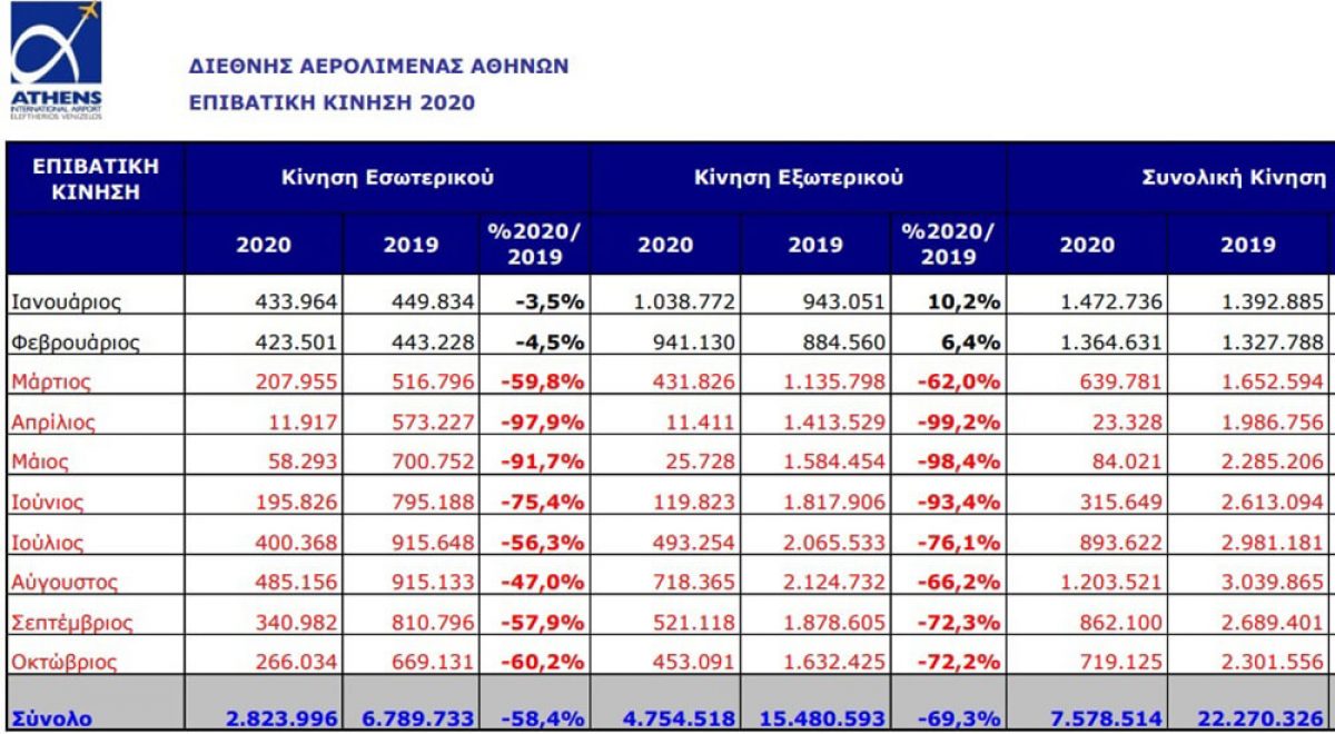 Την περίοδο Ιανουαρίου - Οκτωβρίου, η επιβατική κίνηση του αεροδρομίου της Αθήνας έφτασε τα 7.578.514, σημειώνοντας μείωση 66% σε σχέση με την αντίστοιχη περίοδο του 2019. Η διεθνής κίνηση μειώθηκε κατά 69,3%, ενώ οι επιβάτες εσωτερικού παρουσίασαν μείωση κατά 58,4%. Επιπλέον, το φετινό Οκτώβριο η επιβατική κίνηση