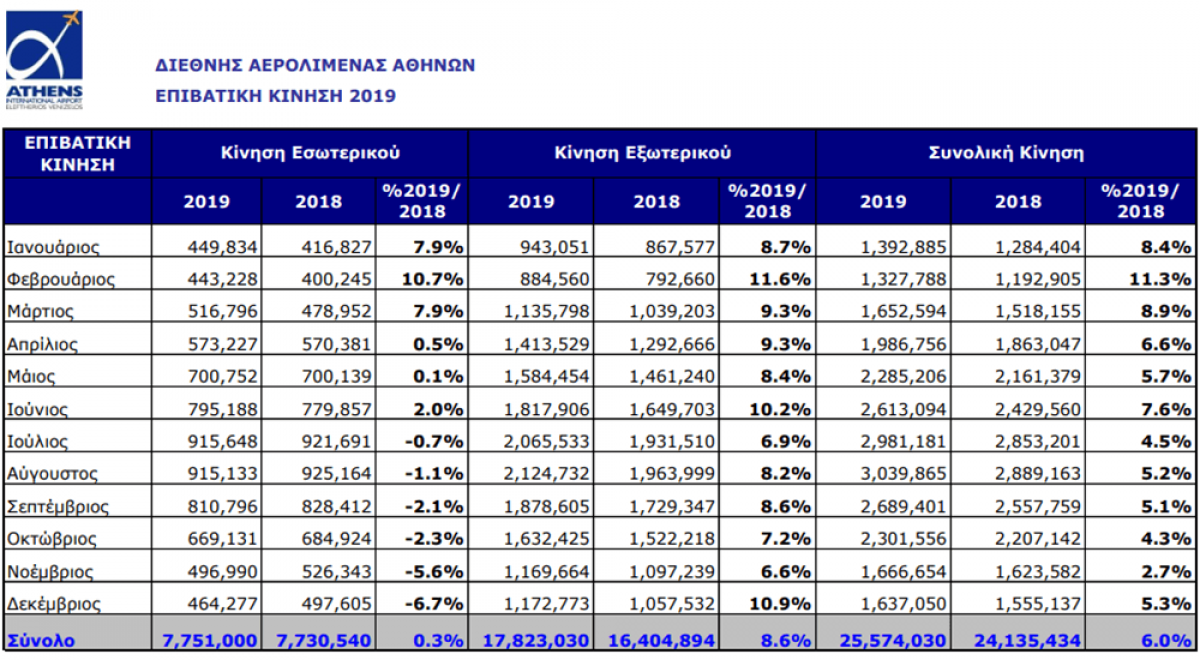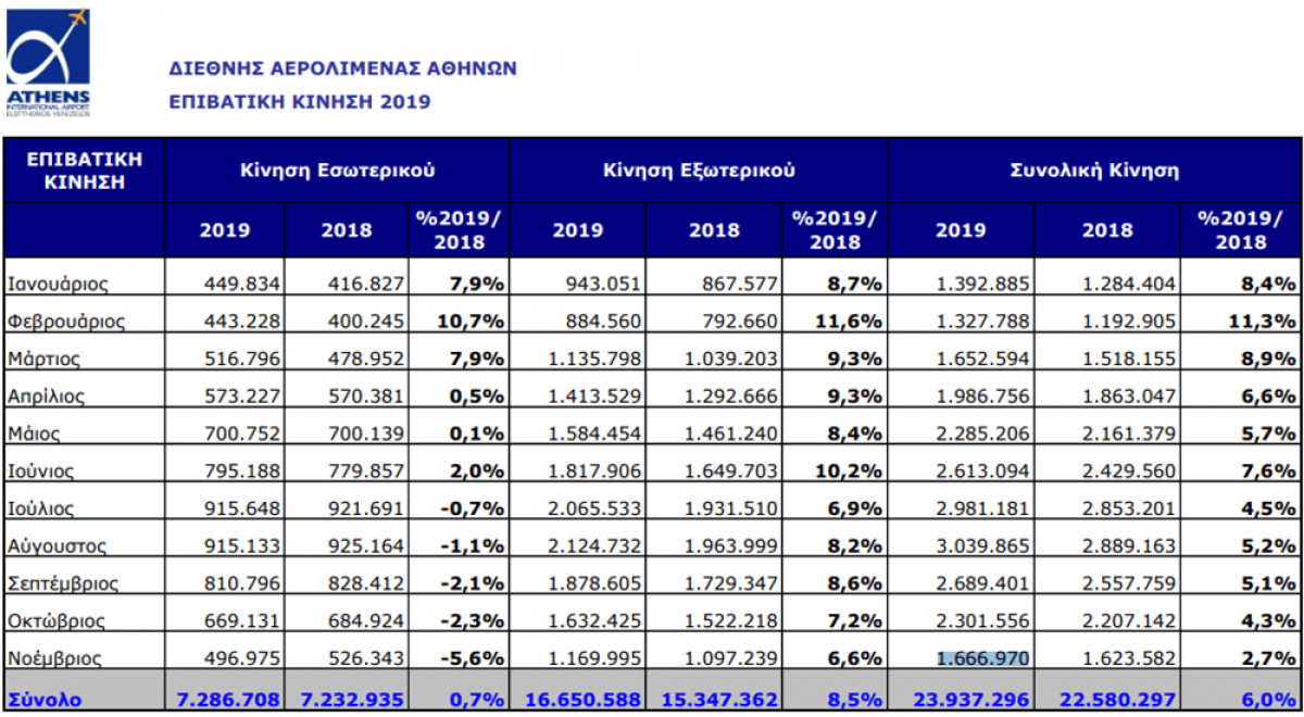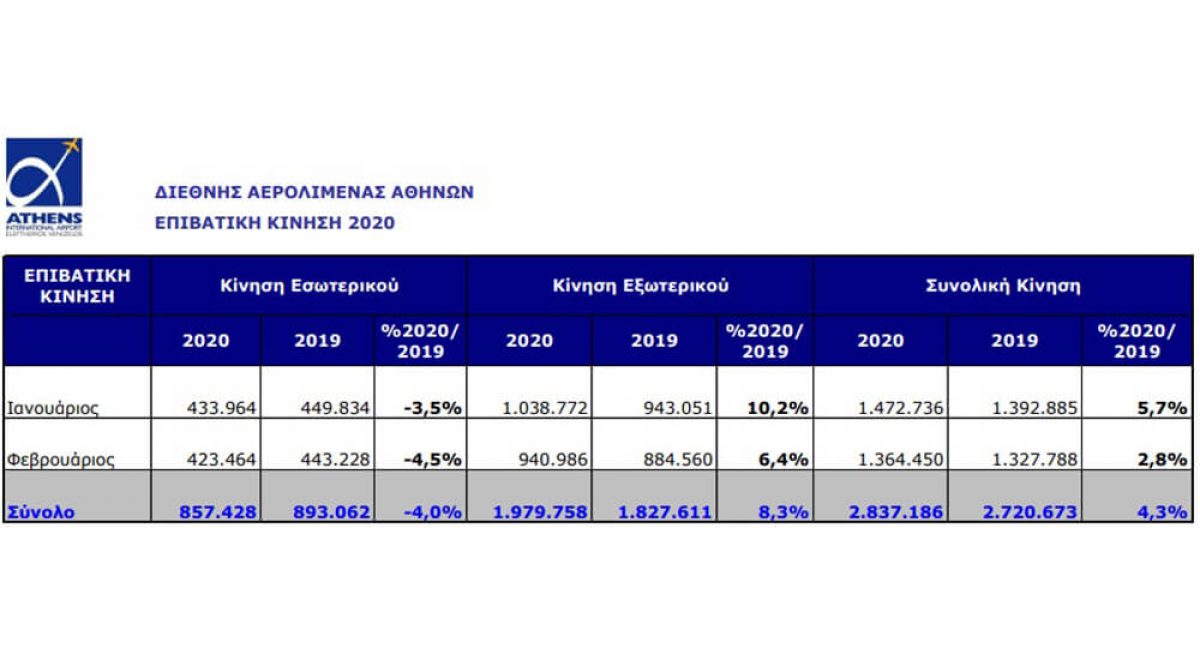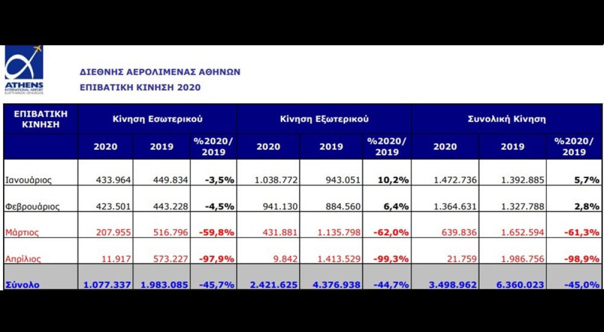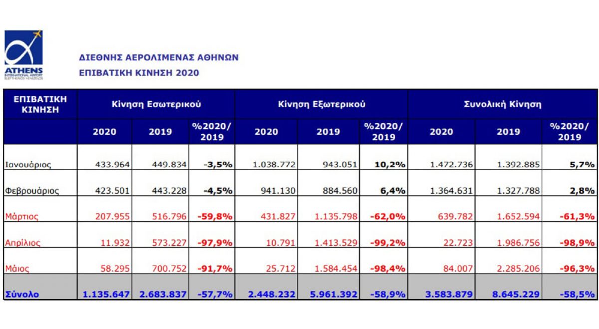 Την περίοδο Ιανουαρίου - Οκτωβρίου, η επιβατική κίνηση του αεροδρομίου της Αθήνας έφτασε τα 7.578.514, σημειώνοντας μείωση 66% σε σχέση με την αντίστοιχη περίοδο του 2019. Η διεθνής κίνηση μειώθηκε κατά 69,3%, ενώ οι επιβάτες εσωτερικού παρουσίασαν μείωση κατά 58,4%. Επιπλέον, το φετινό Οκτώβριο η επιβατική κίνηση