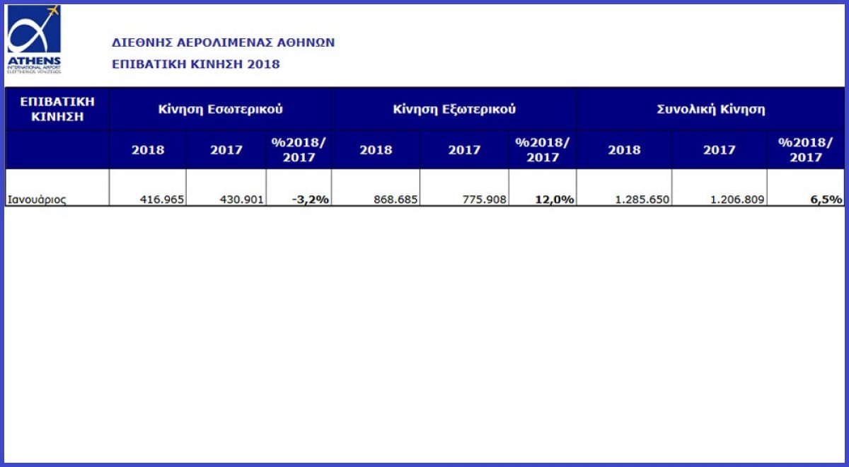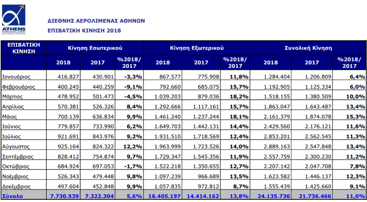 Το 2018, το αεροδρόμιο της Αθήνας κατέγραψε την καλύτερη ιστορική επίδοσή του από πλευράς επιβατικής κίνησης με 24.135.736 επιβάτες, ξεπερνώντας κατά 2,4 εκατομμύρια επιβάτες (+11%) την κίνηση του 2017 (21.736.466 επιβάτες). Το αποτέλεσμα αυτό οφείλεται στη σημαντική άνοδο της κίνησης εξωτερικού (+2.000.000 ή +13,8%), σε συνδυασμό με την