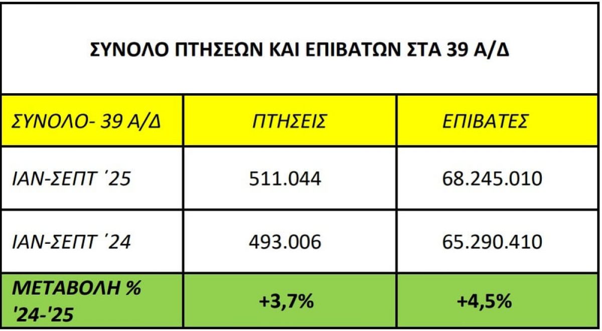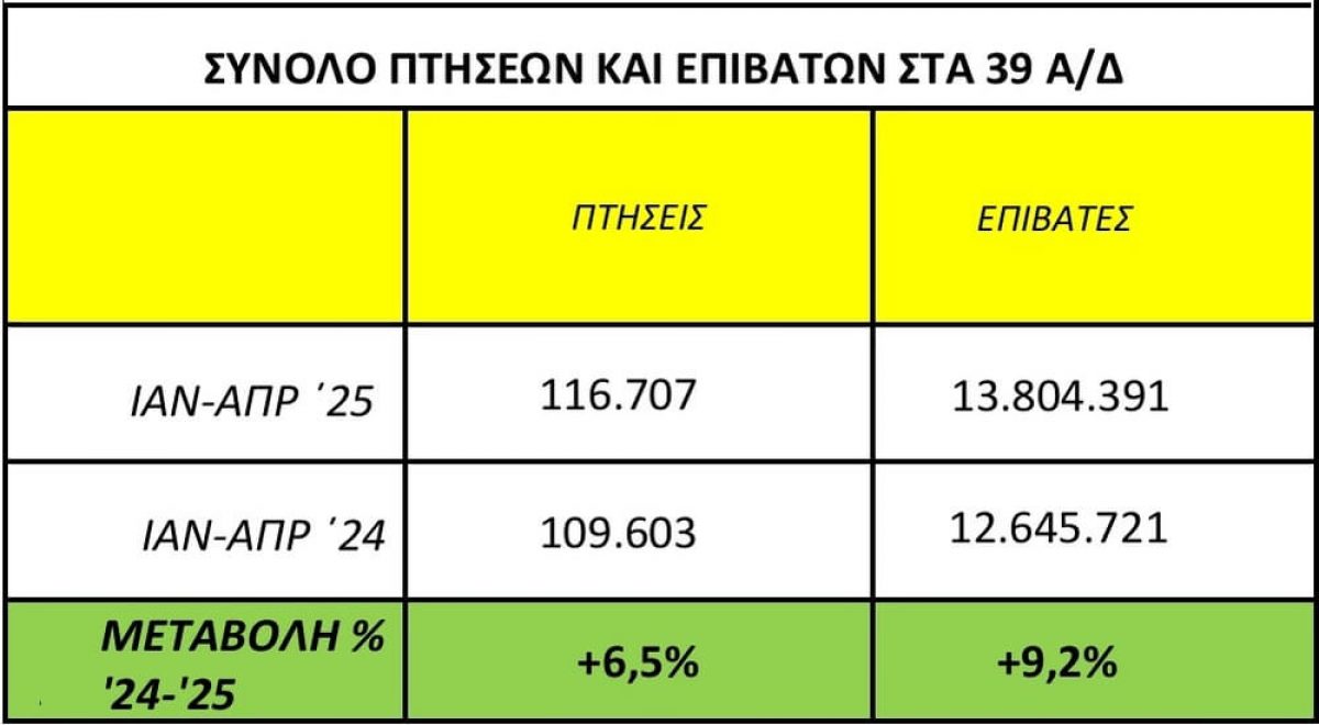 Αύξηση 4,5% σημειώθηκε στην επιβατική κίνηση στο πρώτο εννιάμηνο του 2025, στο σύνολο των αεροδρομίων της χώρας που διεξάγονται εμπορικές πτήσεις (39 αεροδρόμια: 24 της Υπηρεσίας Πολιτικής Αεροπορίας - ΥΠΑ, 14 της Fraport Greece και το αεροδρόμιο της Αθήνας). Συγκεκριμένα, η επιβατική κίνηση το χρονικό διάστημα